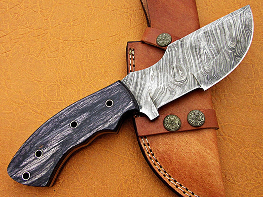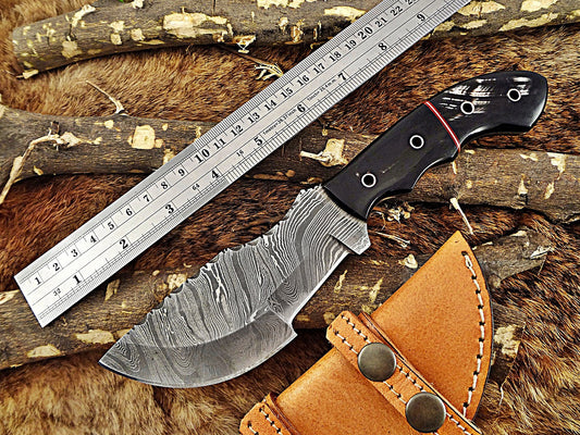 10" Long Damascus steel tracker knife hand forged twist pattern full tang, 2 tone bull horn with holes scale, Cow hide leather sheath