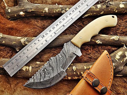 10"Long tracker knife hand forged twist pattern full tang Damascus steel, Natural Camel bone hole scale, Cow hide leather sheath