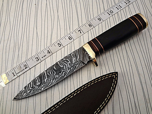 11.5" Long hand forged fire pattern Damascus steel Knife, bull horn with wood & engraved brass scale, thick Cow hide leather sheath