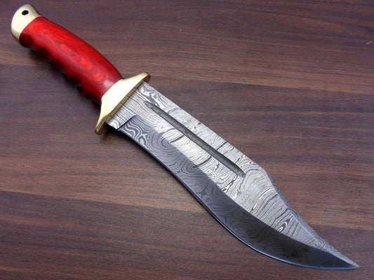 13.5 Inches long Damascus steel custom made hunting Knife, 2 tone Red wood scale with brass finger guard and cap cow hide leather sheath