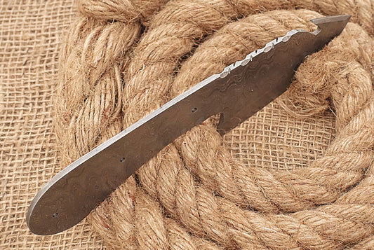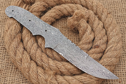 9" Long Damascus Steel Skinning Knife Blank Blade, Can be Used for Straight Back and Trailing Point Skinning, Hand Forged Damascus Steel, 4.5" Scale Space with 3 Pin Hole, 3.5 inches Cutting Edge