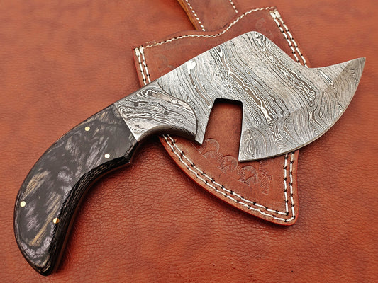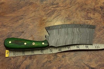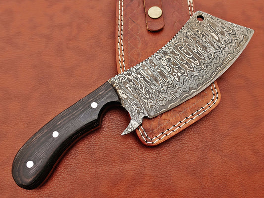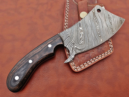 9" hand forged Twist Pattern Damascus steel chopper, 2 tone Dollar wood scale compact cleaver, Leather sheath included