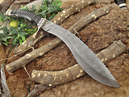 Damascus Steel Kukri Knife 15 Inches custom made Hand Forged With 10" long blade, Bull horn with engraved brass scale, Cow Leather Sheath