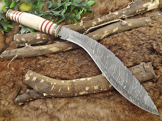15" custom made Hand Forged Damascus Steel Kukri Knife With 10" blade, camel bone with engraved brass finger guard scale, Leather Sheath
