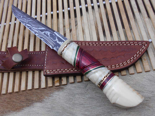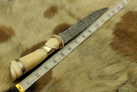 13 Inches long custom made Hand Forged Damascus Steel dagger Knife With 6.5" blade, exotic colored bone & wood scale cow hide leather sheath