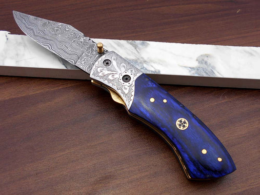 8" long hand forged custom made Damascus steel pocket clip folding knife, Blue Colored wood scale with engraved steel Bolster, Cow hide leather sheath included