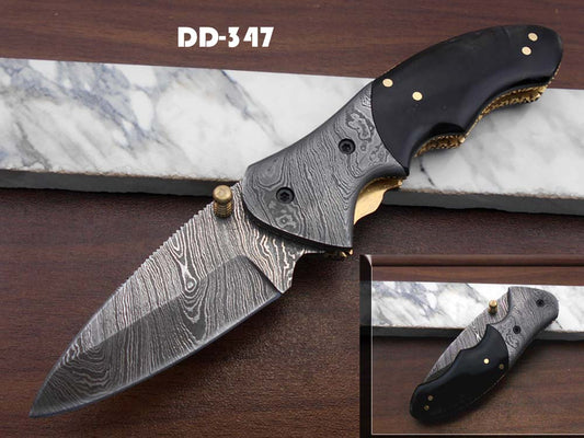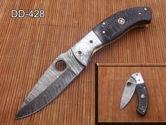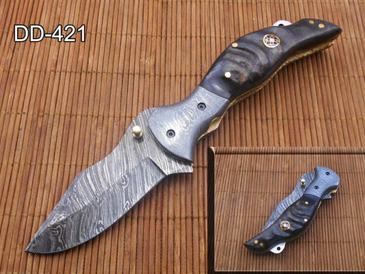 8 Inch Damascus steel folding knife, Available in Bone, Bull horn and Ram scales with Damascus bolster, Equipped with Thumb closing knob and liner lock, Cow hide Leather sheath with belt loop