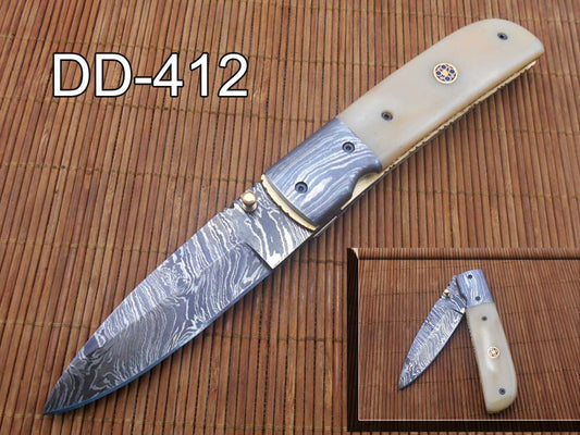 7"long Folding pocket Knife in 3 scale colors, 3" long Hand Forged Damascus steel legal blade, Various scales available, Cow hide leather sheath included