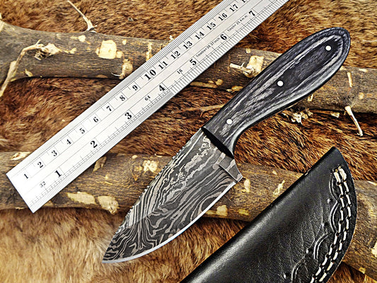 7.5" compact skinning Knife with 4" full tang Damascus steel blade, Available in 2 colors scale, includes Cow hide Leather sheath