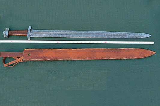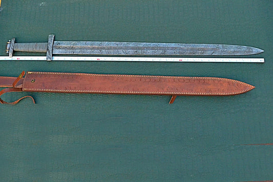 37 inches Long Damascus Steel Blade Medieval Barbarian Sword, 27" Long Hand Forged Damascus Steel Double Edge Blade, Leather Sheath