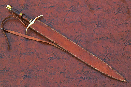 38 inches Long Claymore Sword, 30" Long Hand Forged Damascus Steel Double Edge Blade, Forward Brass Cross hilt Forward and Pommel, Leather Scabbard with Shoulder Stripe
