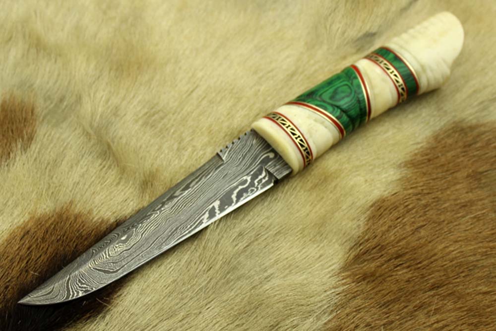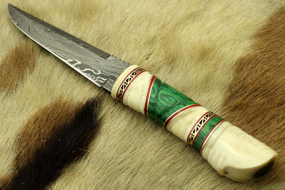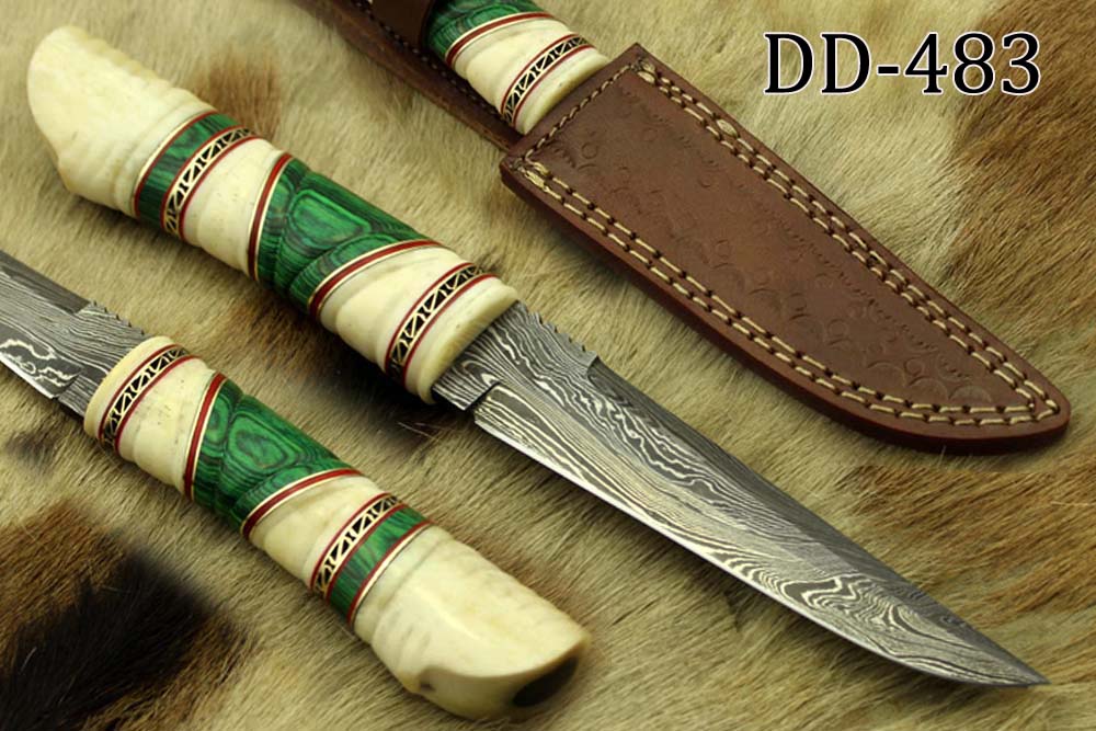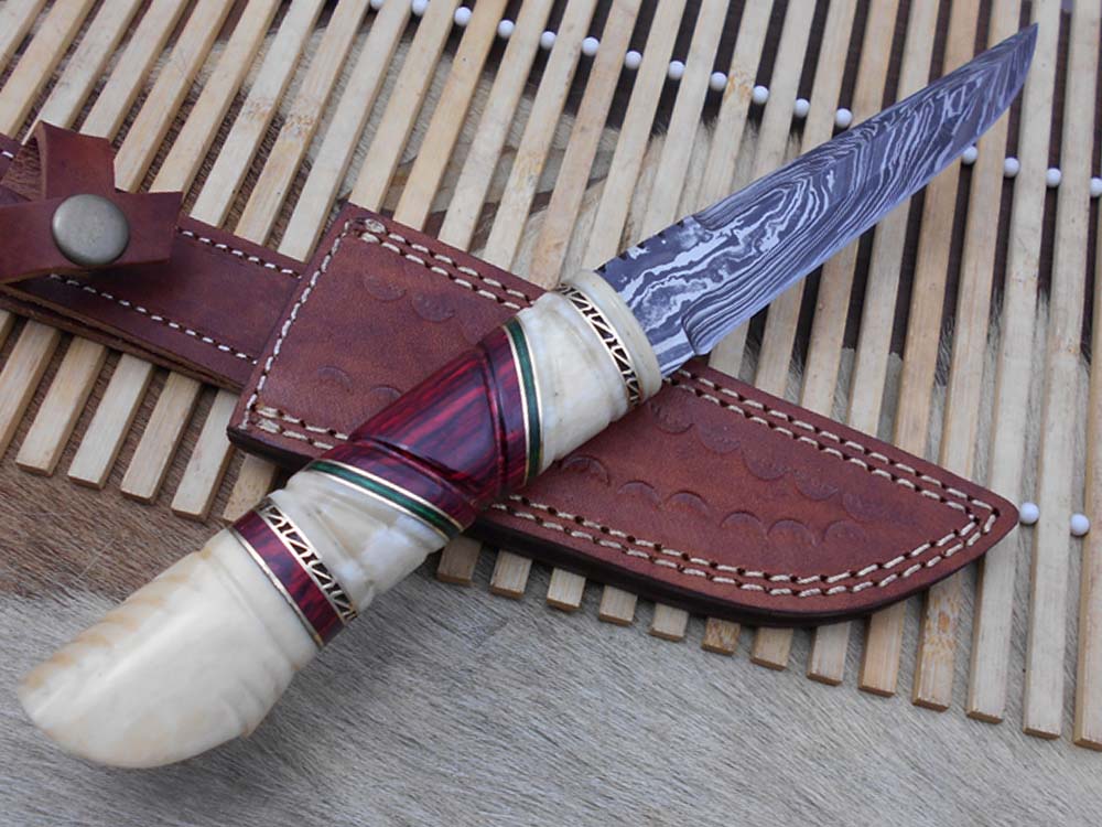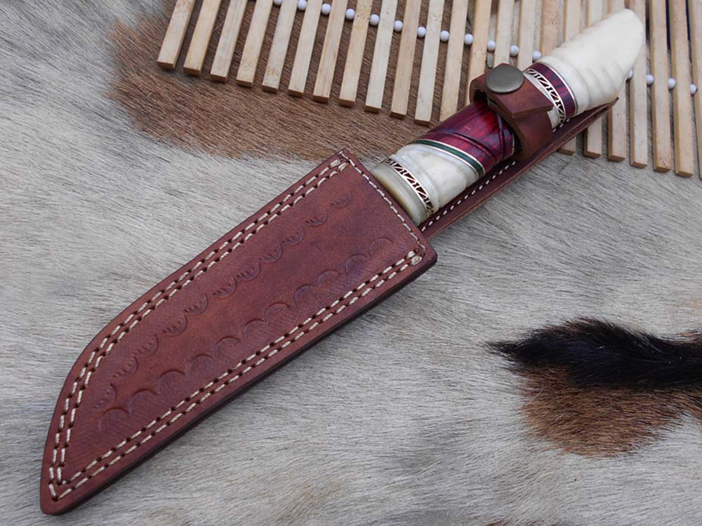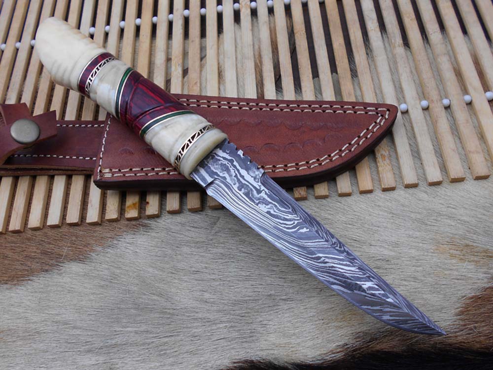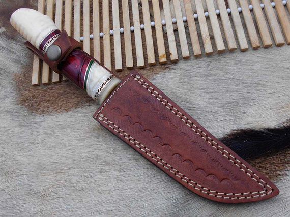 10.5" Long Damascus steel hunting Knife hand forged, hand crafted exotic round scale scale with camel bone brass & fiber, Cow Leather sheath