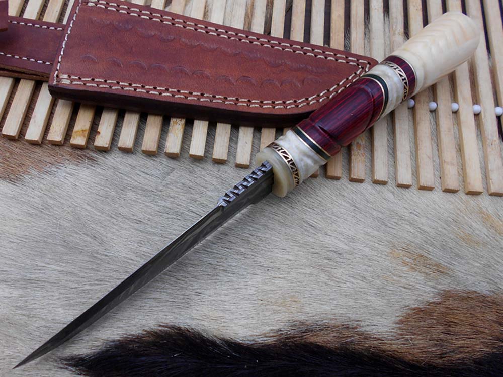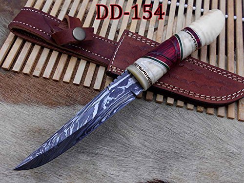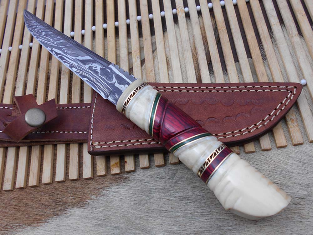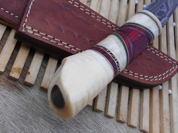 10.5" Long Damascus steel hunting Knife hand forged, hand crafted exotic round scale scale with camel bone brass & fiber, Cow Leather sheath