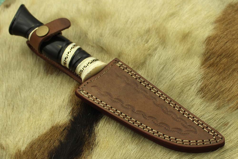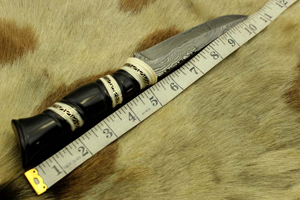 10.5" Long Damascus Steel Knife Hand Forged, Sliced Camel Bone & Bull Horn with Engraved Brass Spacer Hand Crafted Round Scale, Cow Hide Leather Sheath