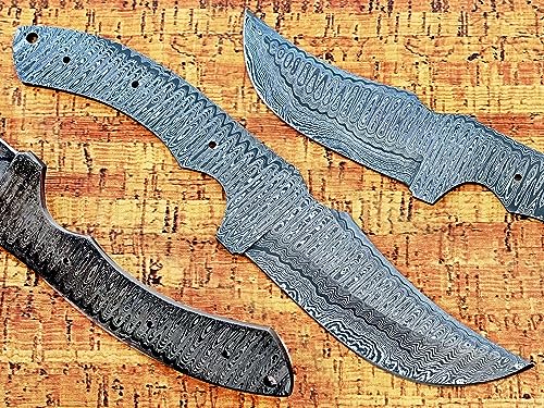 10 inches Long Hand Forged Ladder Pattern Damascus Steel Trailing Point Blank Blade Skinning Knife, 4.5" Long Sharp Cutting Edge, 5" Scale Space with 3 pins and a lace Hole