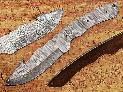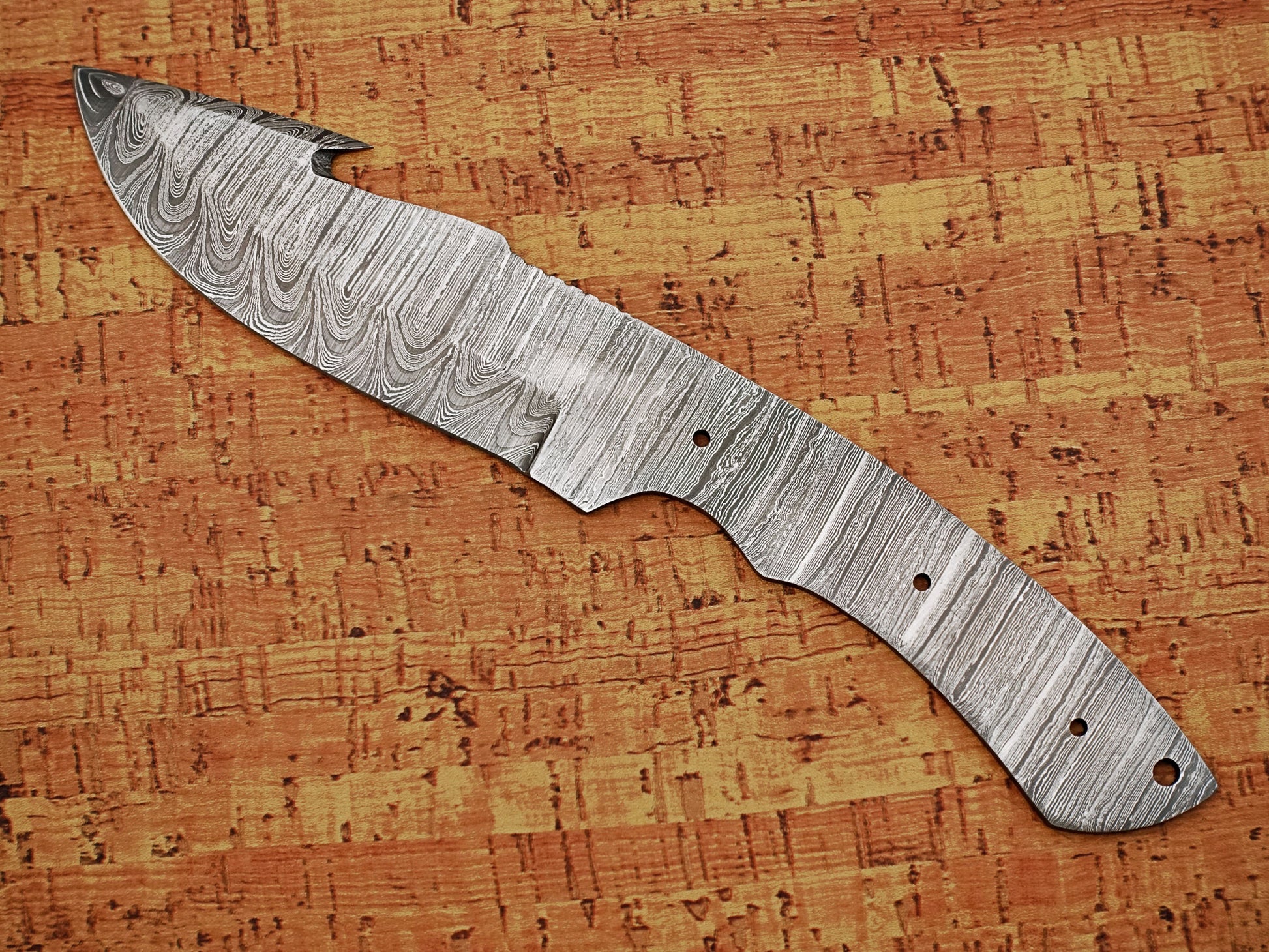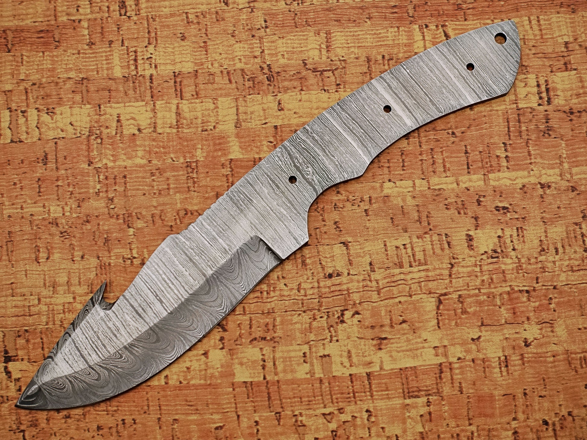 Overall 10 inches Long hand forged full tang twist pattern Damascus steel blank blade. Real Damascus steel (not graphic) 5 inches long drop point blade with sharp gut hook. 4.5" cutting edge 5" long Scale space with 3 pins and lace hole, 1 Finger groves Approximately 5 mm Thick twist pattern Damascus steel blade. Our Damascus steel is prepared by forging over 200 layer of high carbon and low carbon steel. Blade has been tempered, Grinded and given an excellent heat treatment to get it well hardened. Our testeed hardness is 56-58 HRC.