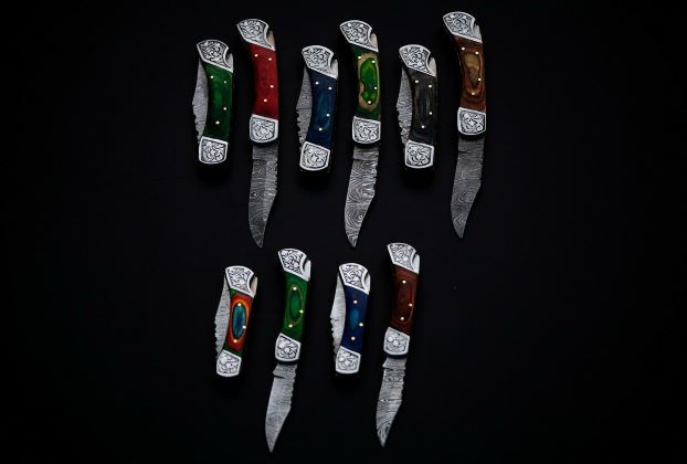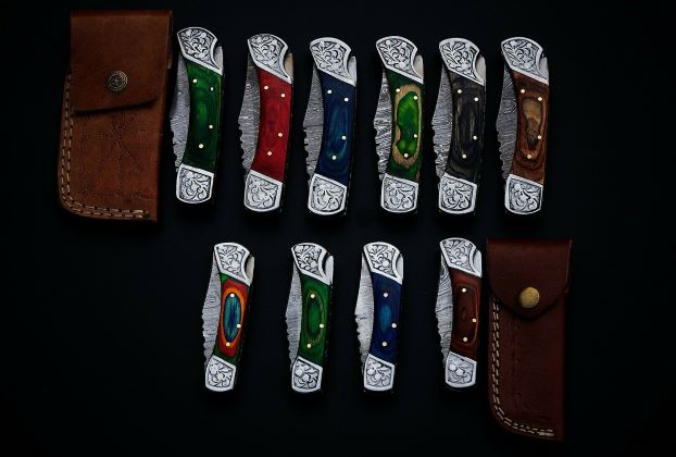 10 pieces 8.5 and 7.5" Damascus steel back lock folding knife set with Sheath