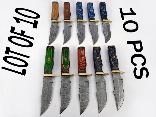 10 pieces Damascus steel fixed blade skinning knives lot with Leather sheath. Over 70 inches long Damascus steel knives in assorted colors