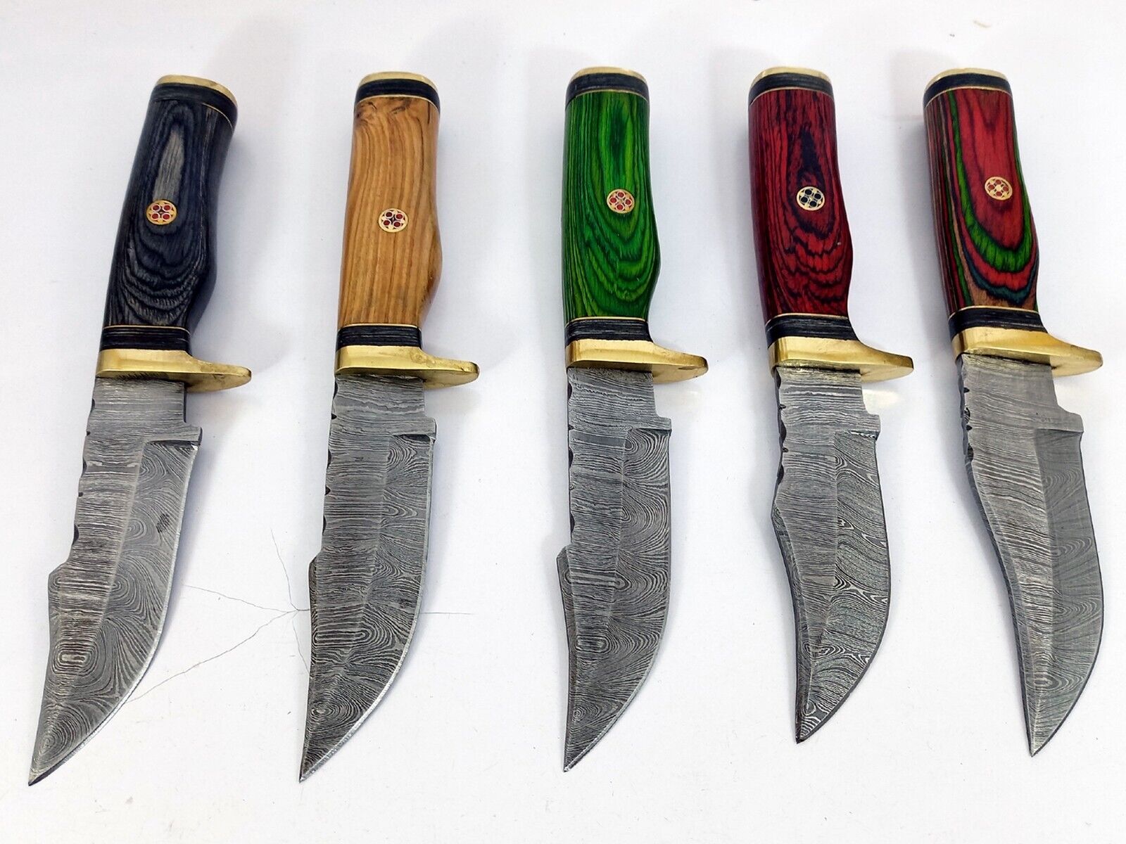 10 pieces Damascus steel Assorted colors Raisen and wood scale skinning knives set. Approximately 85 inches long Damascus steel blade knives, Cow hide leather sheath