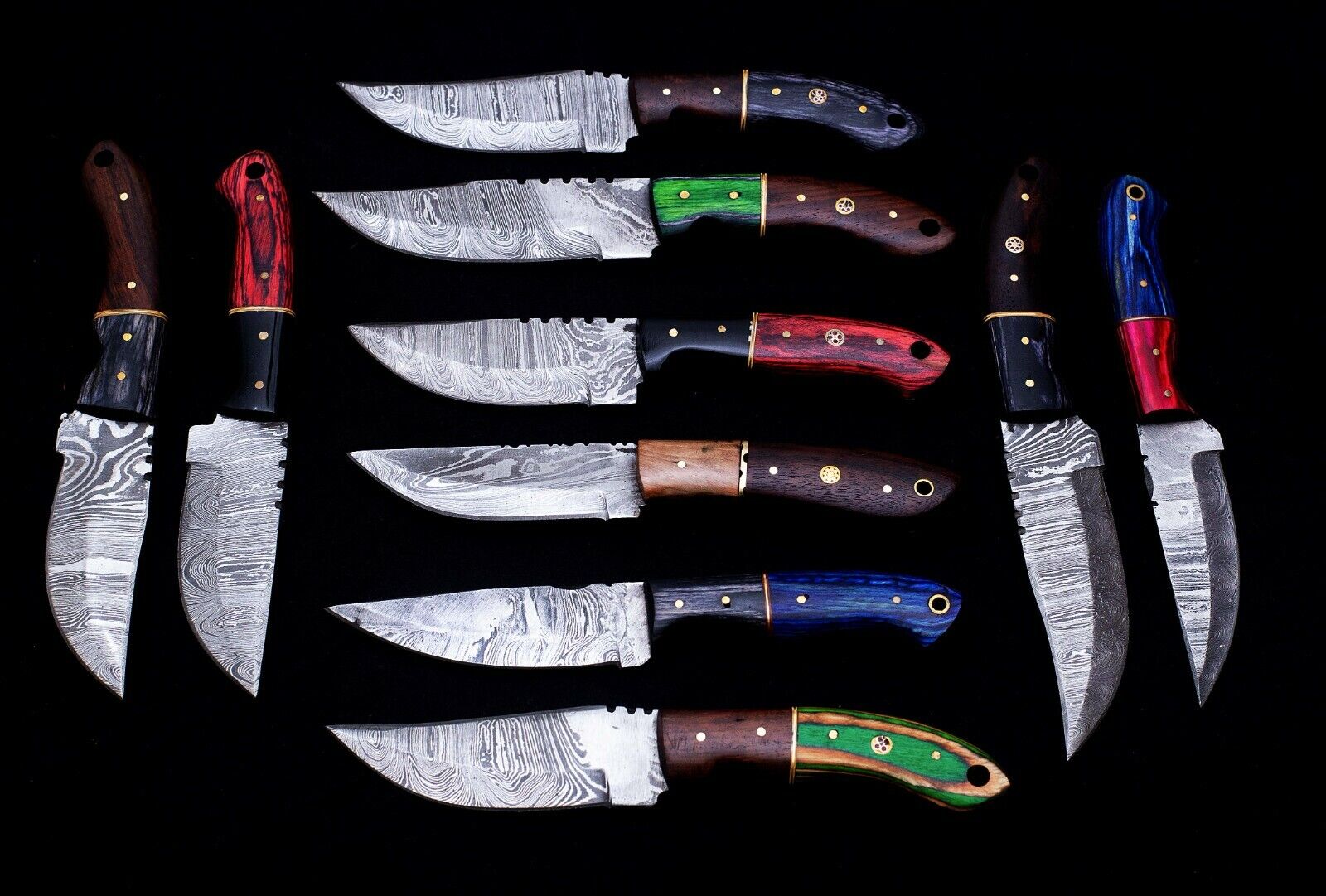 10 pieces Damascus steel Assorted colors Raisen and wood scale skinning knives set. Overall 85 inches long Damascus steel blade knives, Cow hide leather sheath