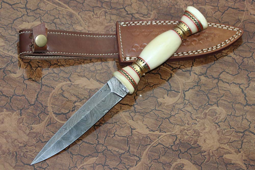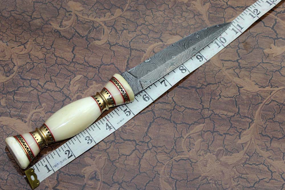 Features: 11 inches long double edge Dagger knife Round grip Camel bone scale with engraved brass spacer 5.5 Inches long scale is crafted with hand engraved brass spacer 5 Inches long Hand forged double edge Damascus steel rat rail blade 5 mm thick Twist Pattern Damascus steel Blade Up to the standard of hunting Dagger Knife Comes with a fine quality extra thick cow hide leather sheath with belt loop Blade has given an excellent heat treatment of hardness. Our blade Hardness is 56 to 58 HRC