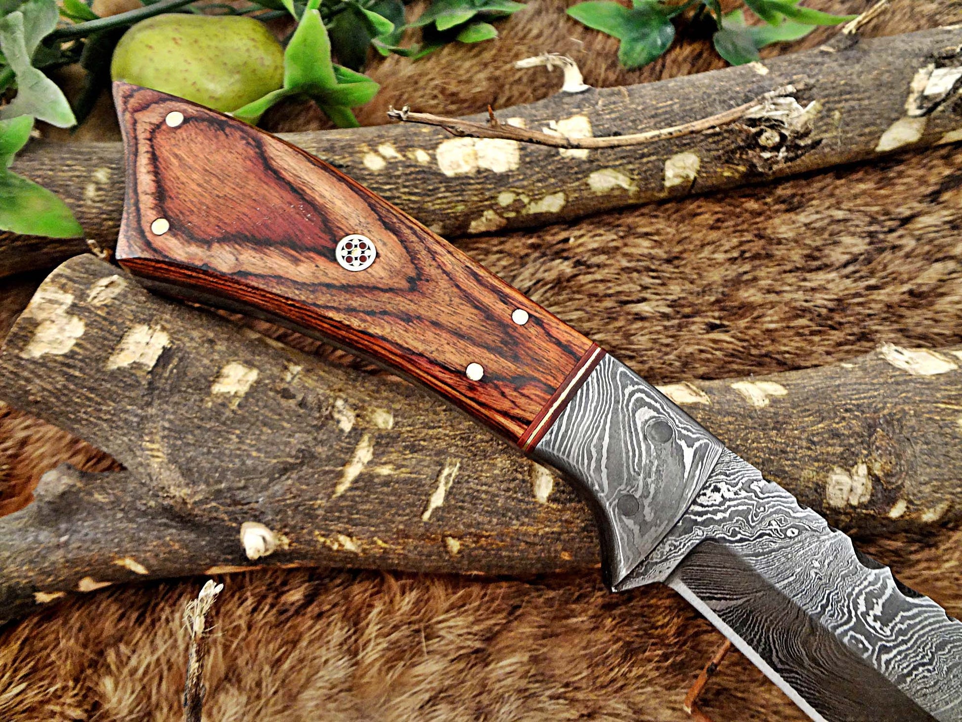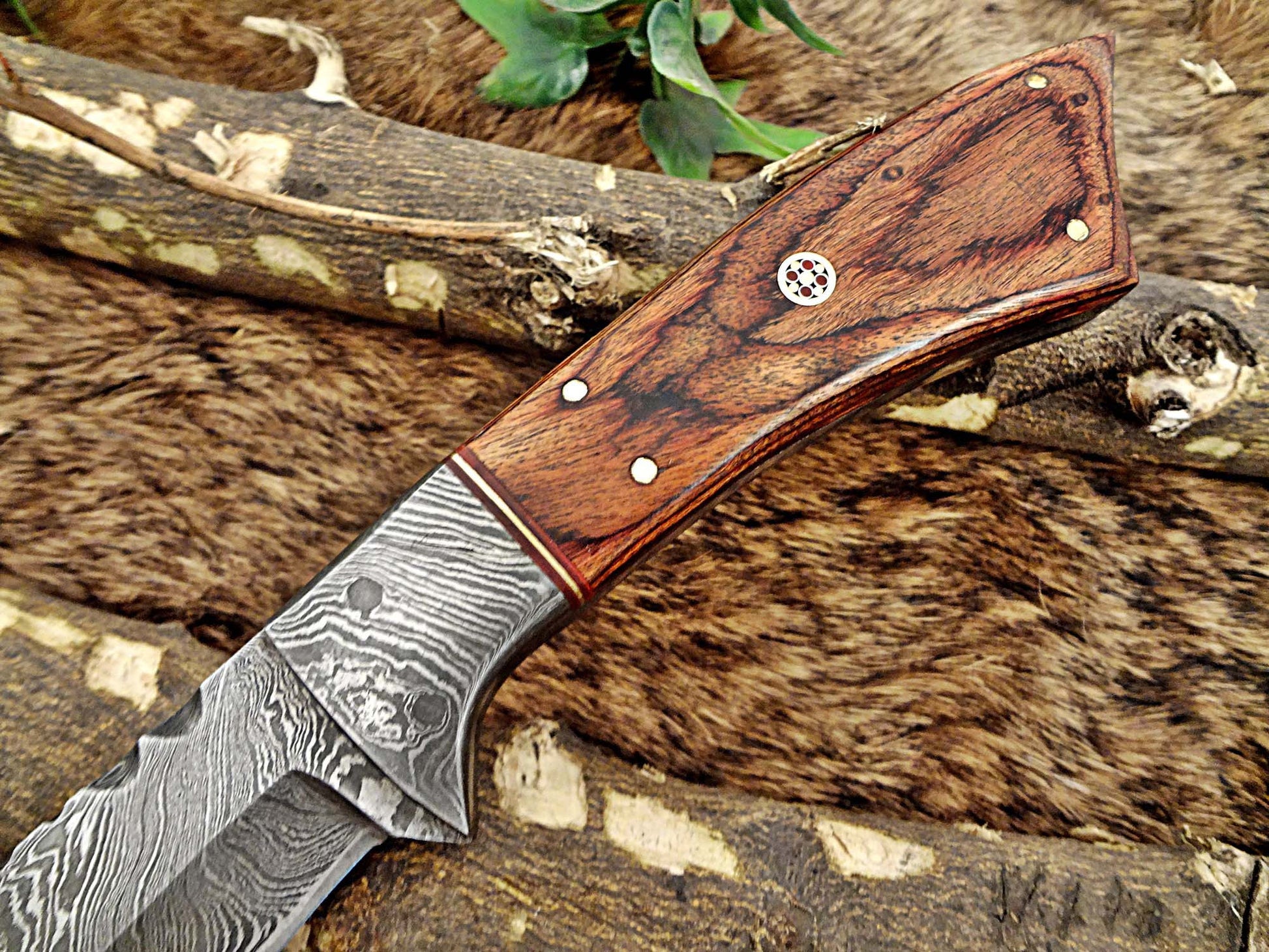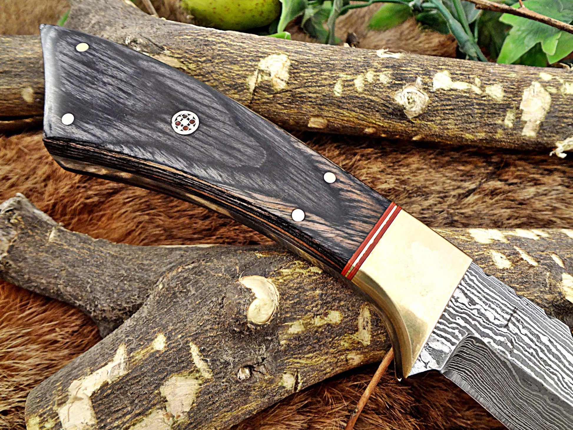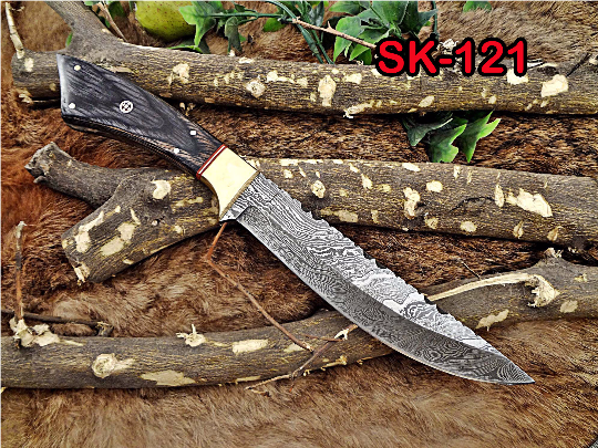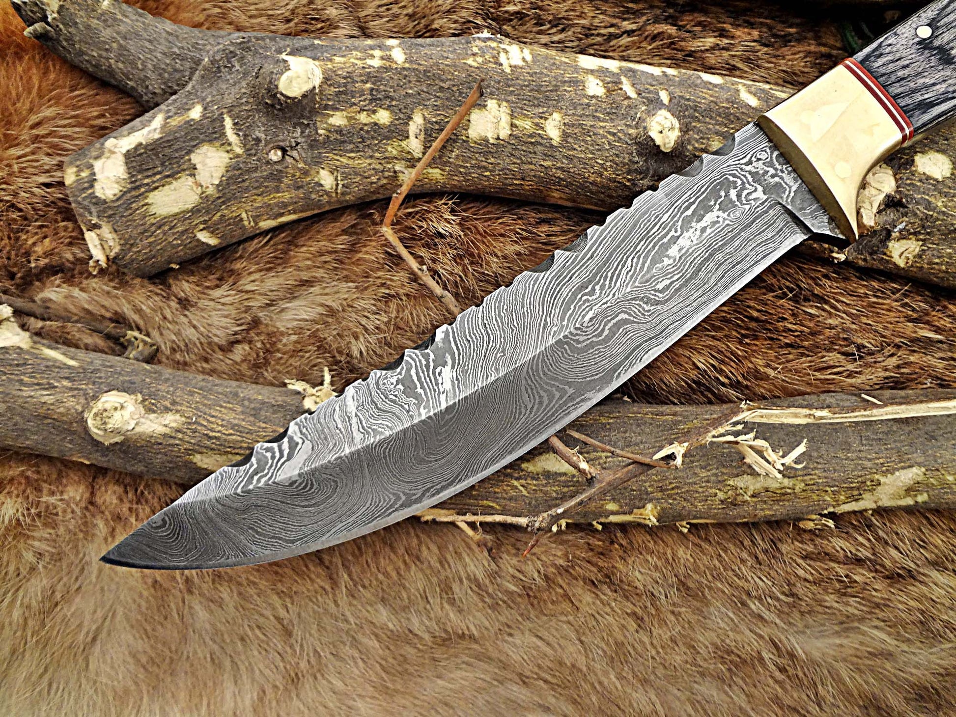11" Long Damascus steel full tang trailing point blade skinning Knife with Leather sheath, Available in 3 scales with bolster