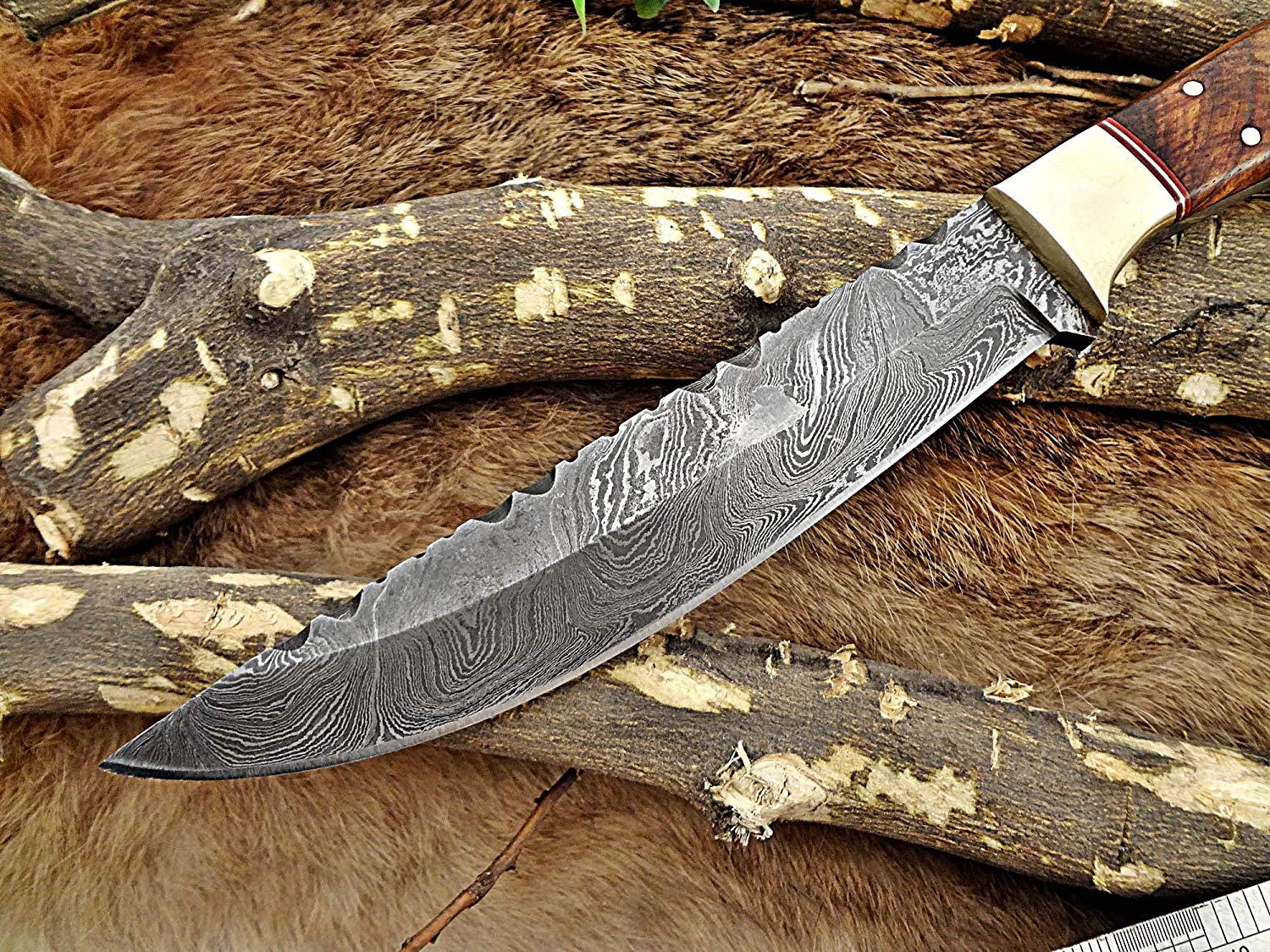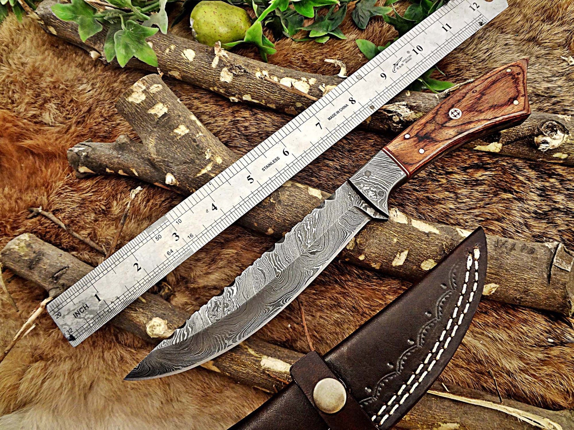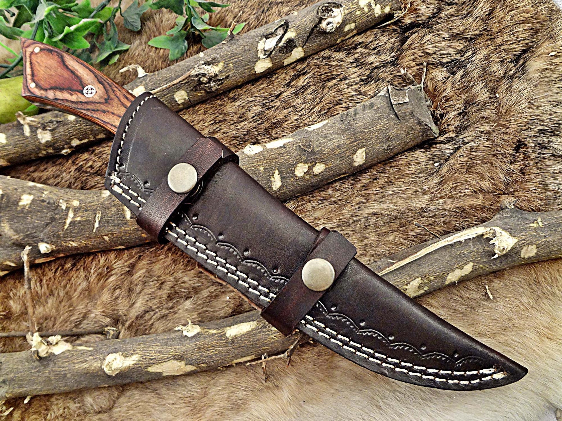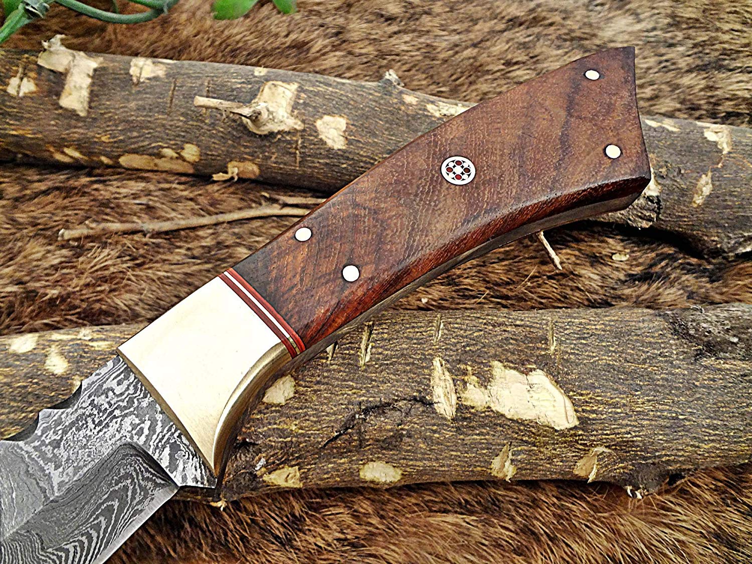 11" Long Damascus steel full tang trailing point blade skinning Knife with Leather sheath, Available in 3 scales with bolster