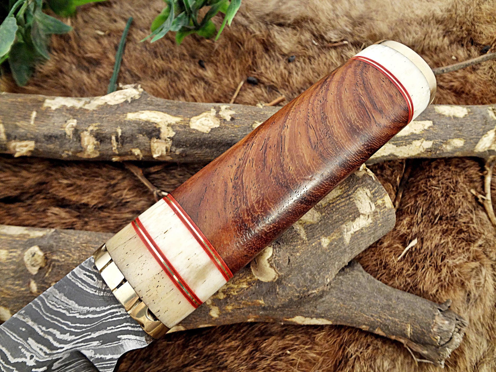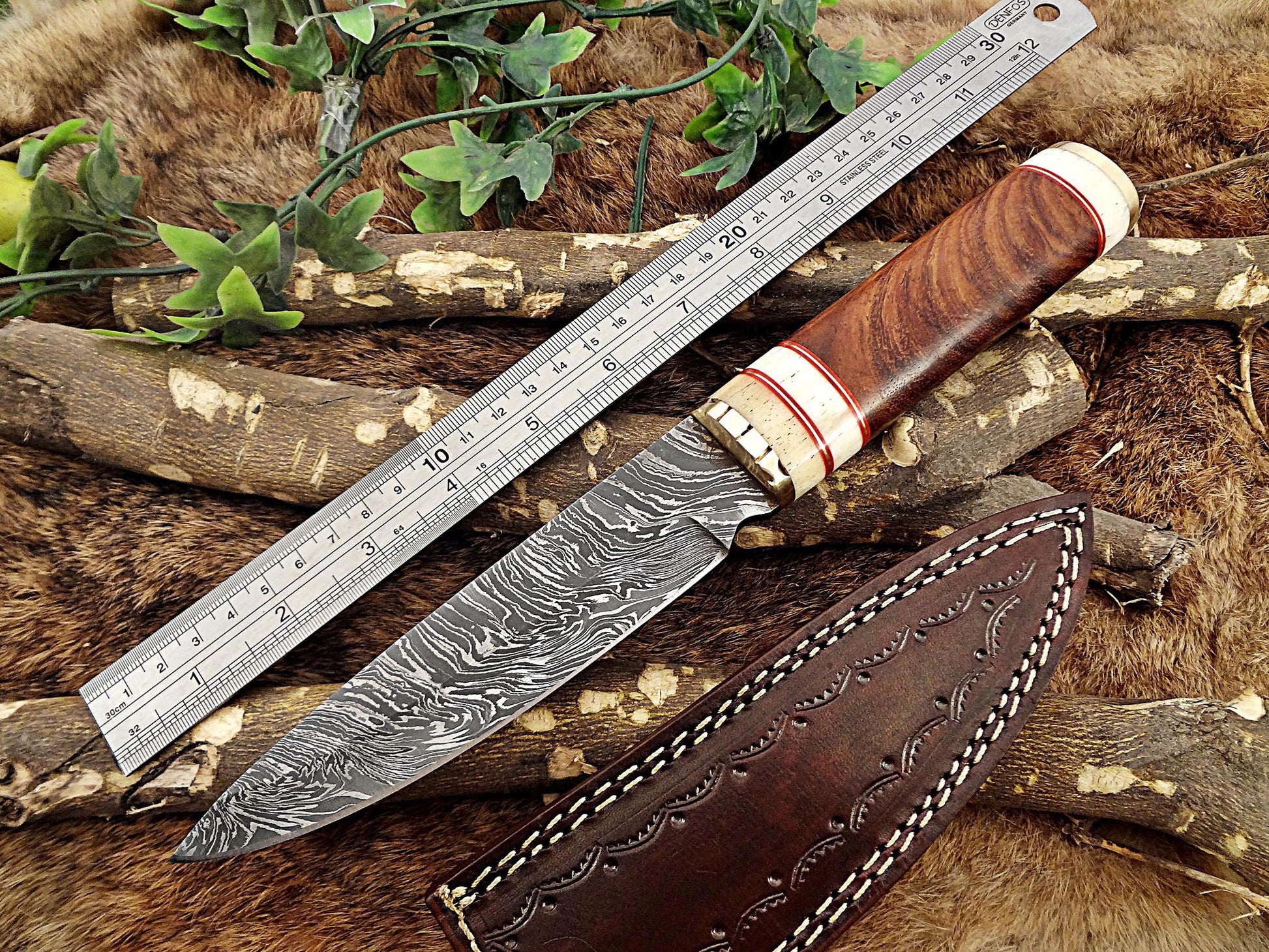 11" Long Damascus steel hunting Knife hand forged Twist pattern, Natural wood with camel bone & brass scale, thick Cow hide leather sheath