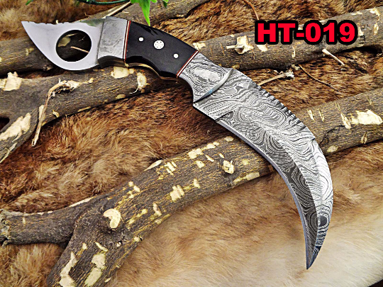 11" Long hand forged Damascus steel full tang Karambit Knife, Natural Bull horn with Damascus Bolster & Pommel finger hole, Leather sheath