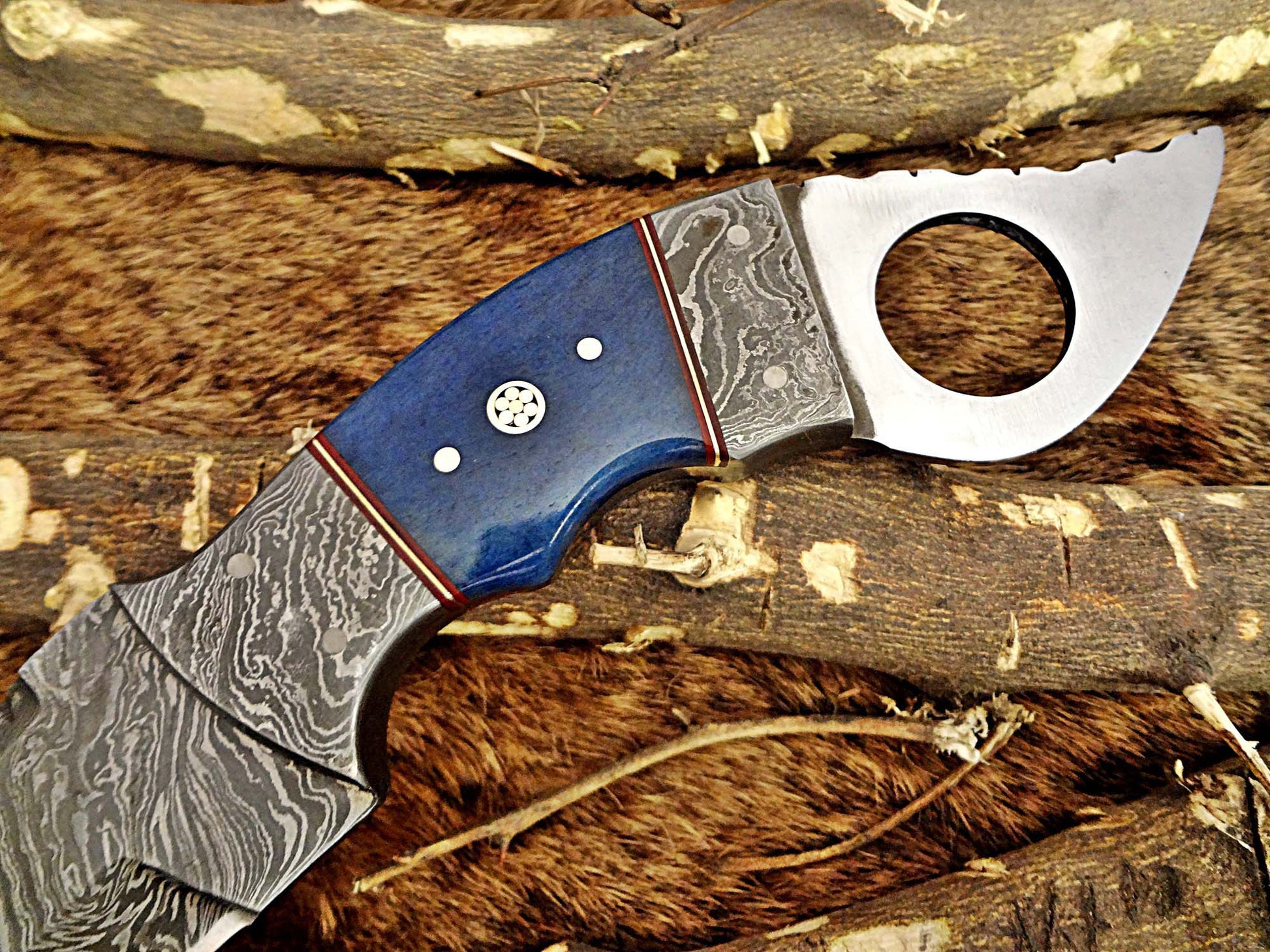 6″ Long Blue Colored bone scale with Damascus Bolster crafted with red fiber & brass spacer