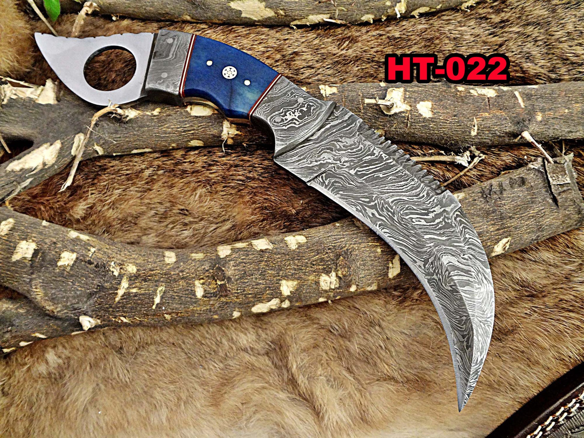 11" Long hand forged Damascus steel Karambit Knife, Colored Camel Bone with Damascus Bolster & Pommel finger hole, Leather sheath