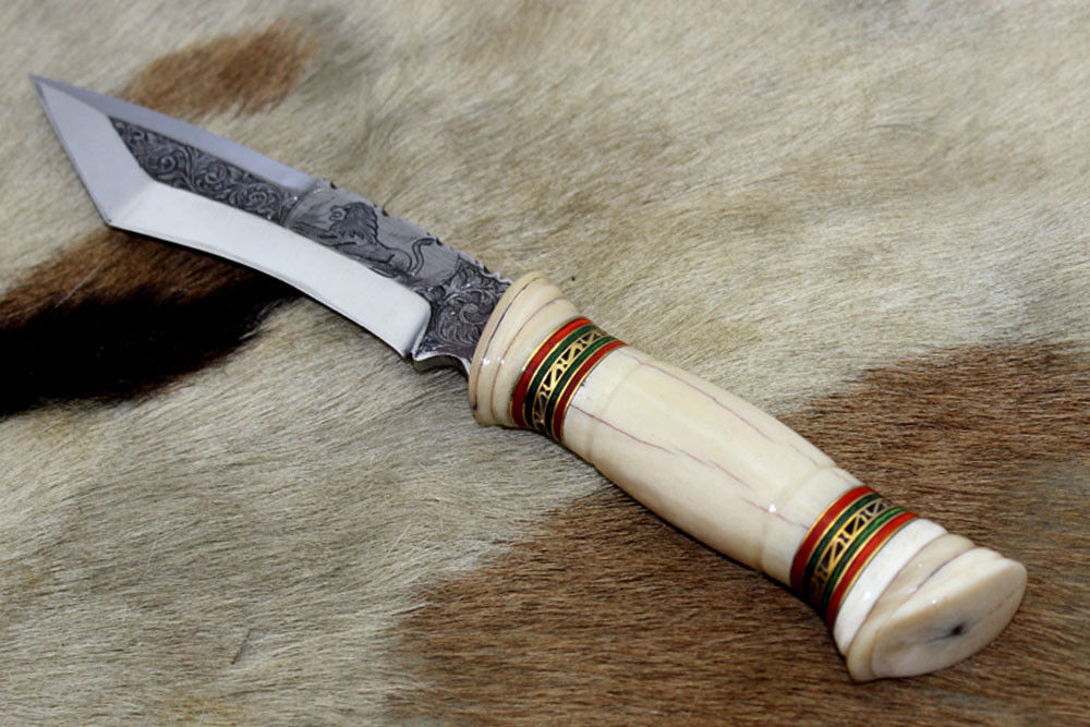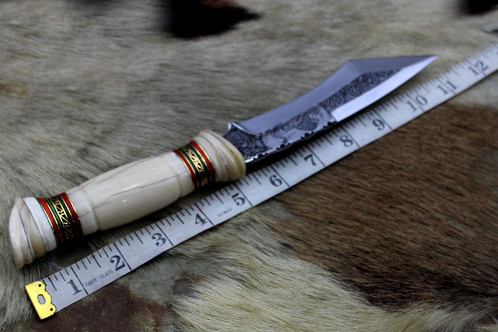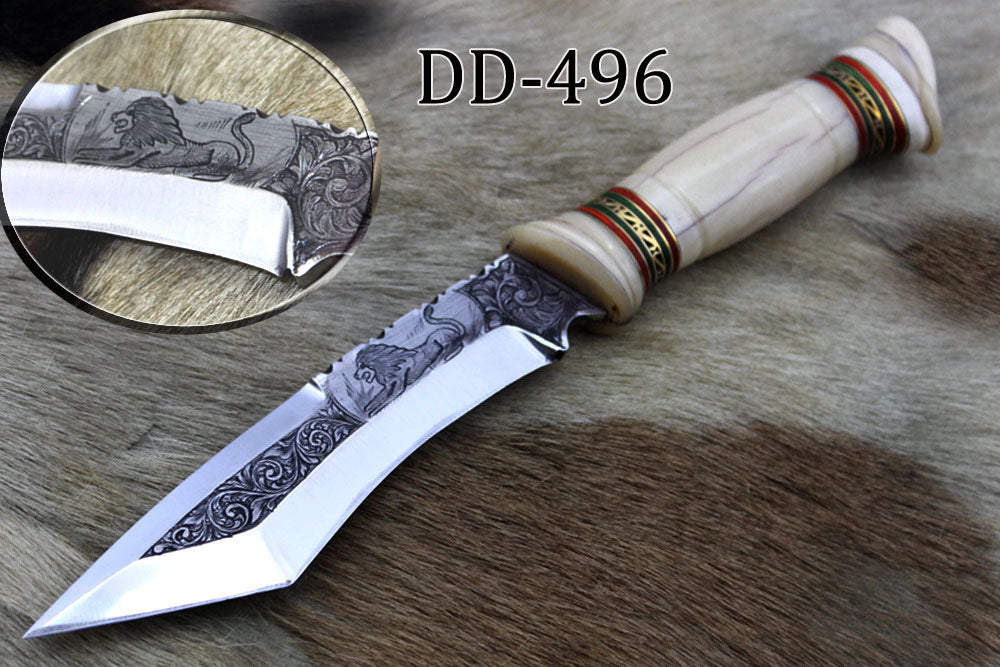 Available in hand forged Damascus steel and hand Engraved stainless steel with hand engraving graphics on both sides.