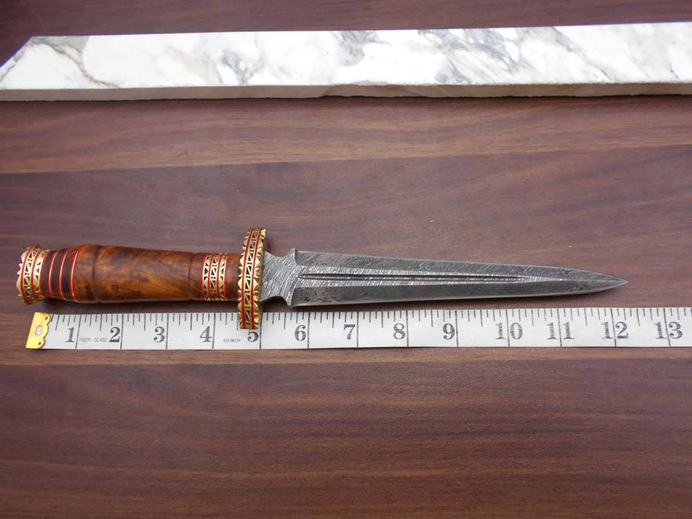 12.2" Long Damascus Dagger hand forged Knife 6.2" dual edge exotic Rose wood scale crafted with engraved brass work and fiber spacing