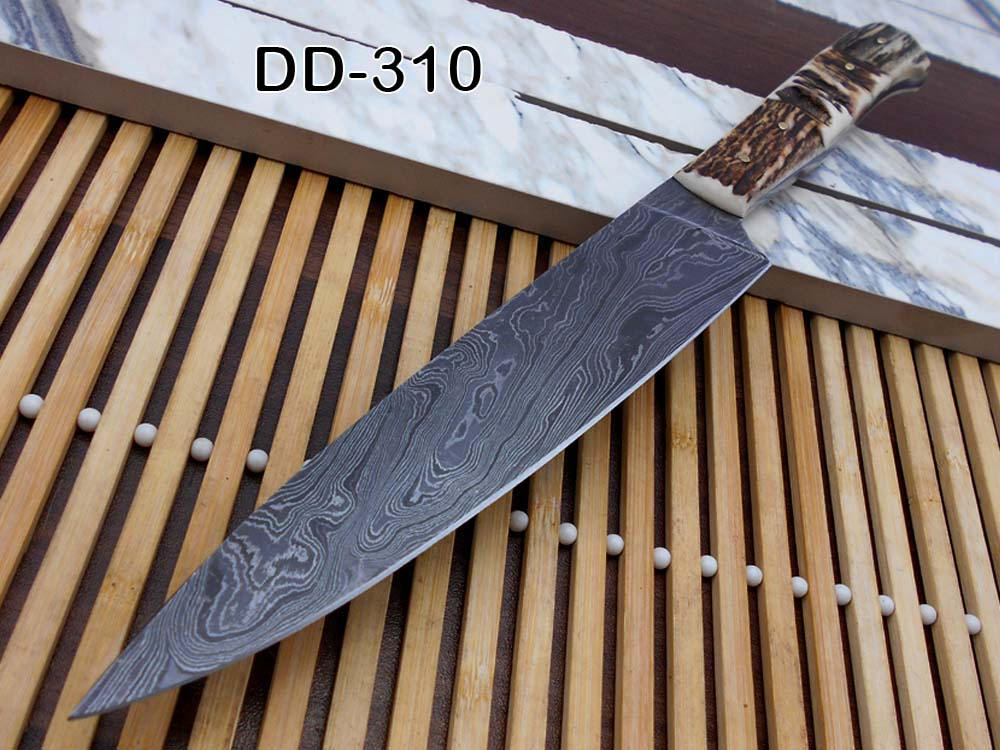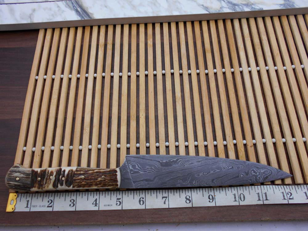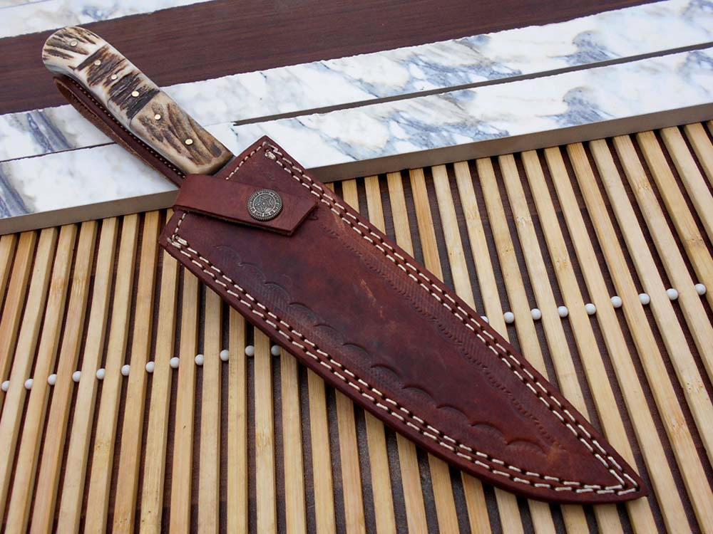 12.5 Inches long custom made Damascus steel full tang 6.5" blade Chef Knife, 5" long stag Antler scale Cow hide Leather sheath
