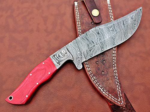 Features: 11" Long hand forged Damascus steel full tang blade skinning Knife. 6.5" long trailing point Damascus steel blade with 5.5" Cutting edge. Black 2 tone Dollar wood scale with Damascus steel bolster 4.5" long Scale is bling with a mosaic and 2 Brass pins for extra strength Overall 11" Long with 5.5" long full tang blade Full tang blades are considered stronger and durable then non full tang Approximately 5 mm thick Twist pattern Damascus steel blade Up to standard skinning and hunting Knife Comes with a fine quality extra thick and robust leather sheath. The sheath has belt inserting loop and can be worn on belt. Blade is made of Damascus steel by forging the 1095 and 15N20 high and low carbon steel Our Damascus steel is prepared by forging over 465 layer of high carbon and low carbon steel. Blade has been given an excellent heat treatment to get it well hardened Hardness 56 to 58 HRC. Tips to Care Damascus knife: Damascus steel as well as 1095 high carbon steel knives are different than some other common steel knives,because of its high carbon content they can be rusted if not care properly. If you have seen rust accidentally then use WD40 to remove it Never store your knife for long time in leather sheath. Leather can absorb water which will rust the knife. Always clean the blade after using and apply oil or wax (please use cooking oil on Chef Knife) before you store it, for its longer life and durability.