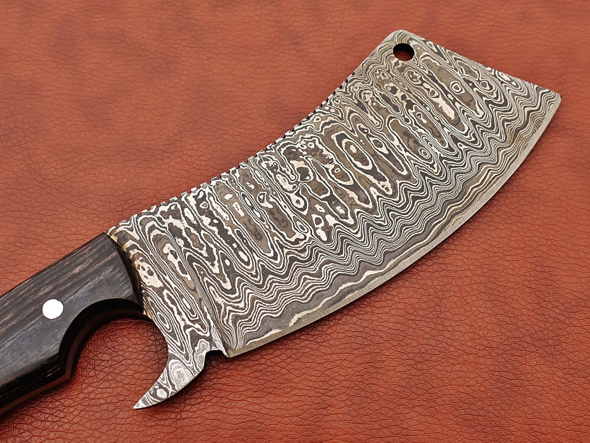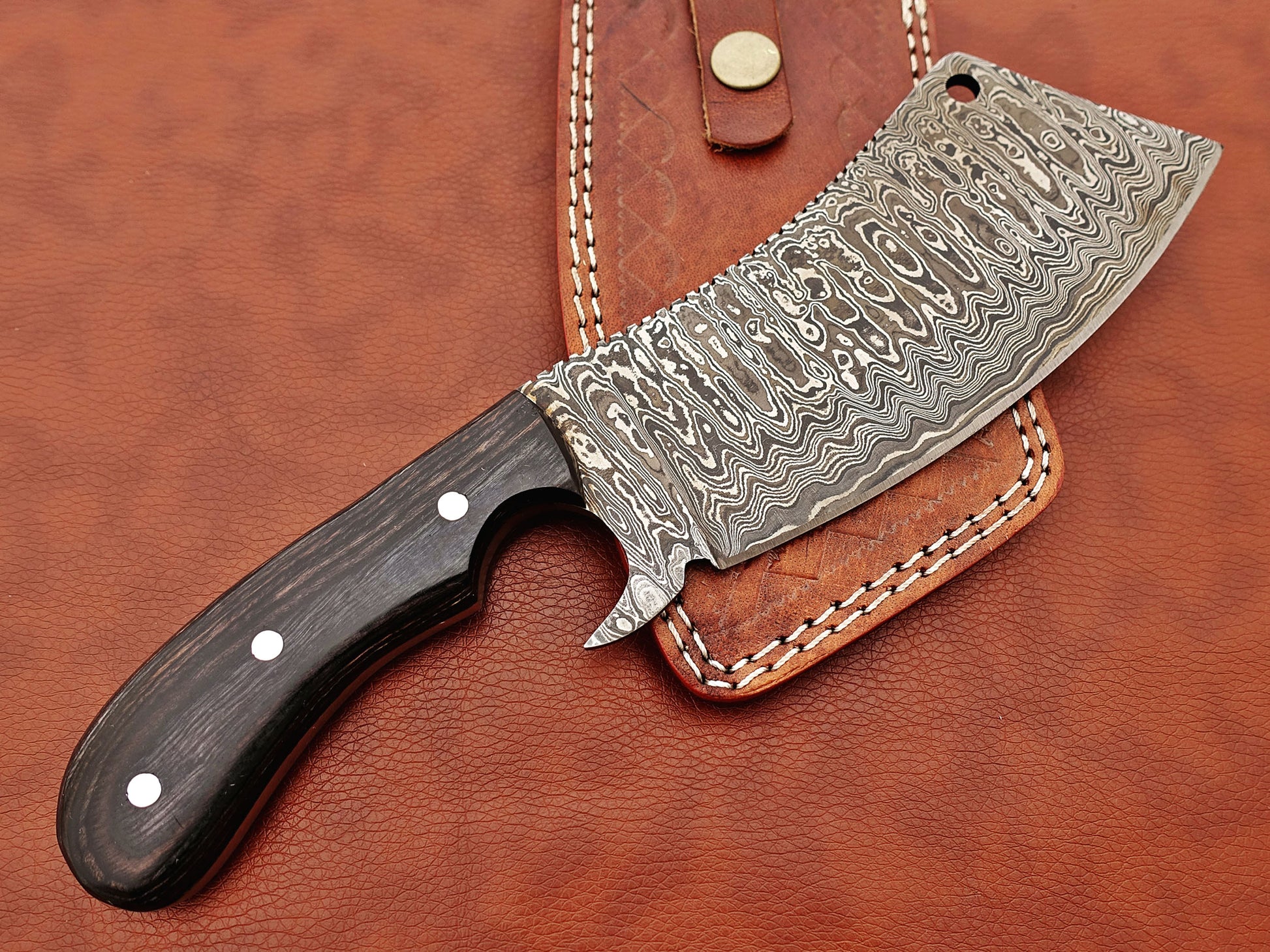 12" hand forged Damascus steel meat Cleaver, Walnut wood scale chopper knife, Leather sheath included