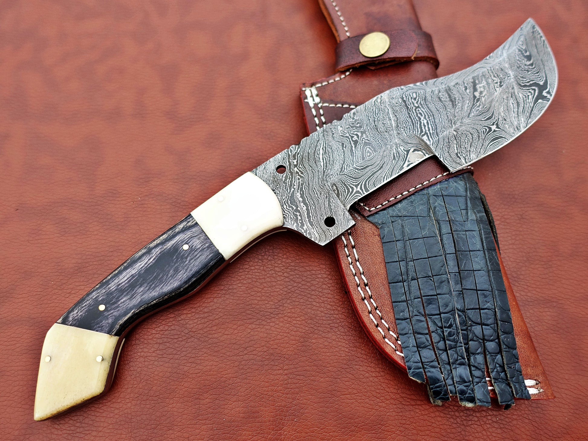 12" Long hand forged twist pattern full tang Damascus steel tracker knife, 2 tone dollar wood scale with Camel bone Bolster & pomel, Cow leather sheath