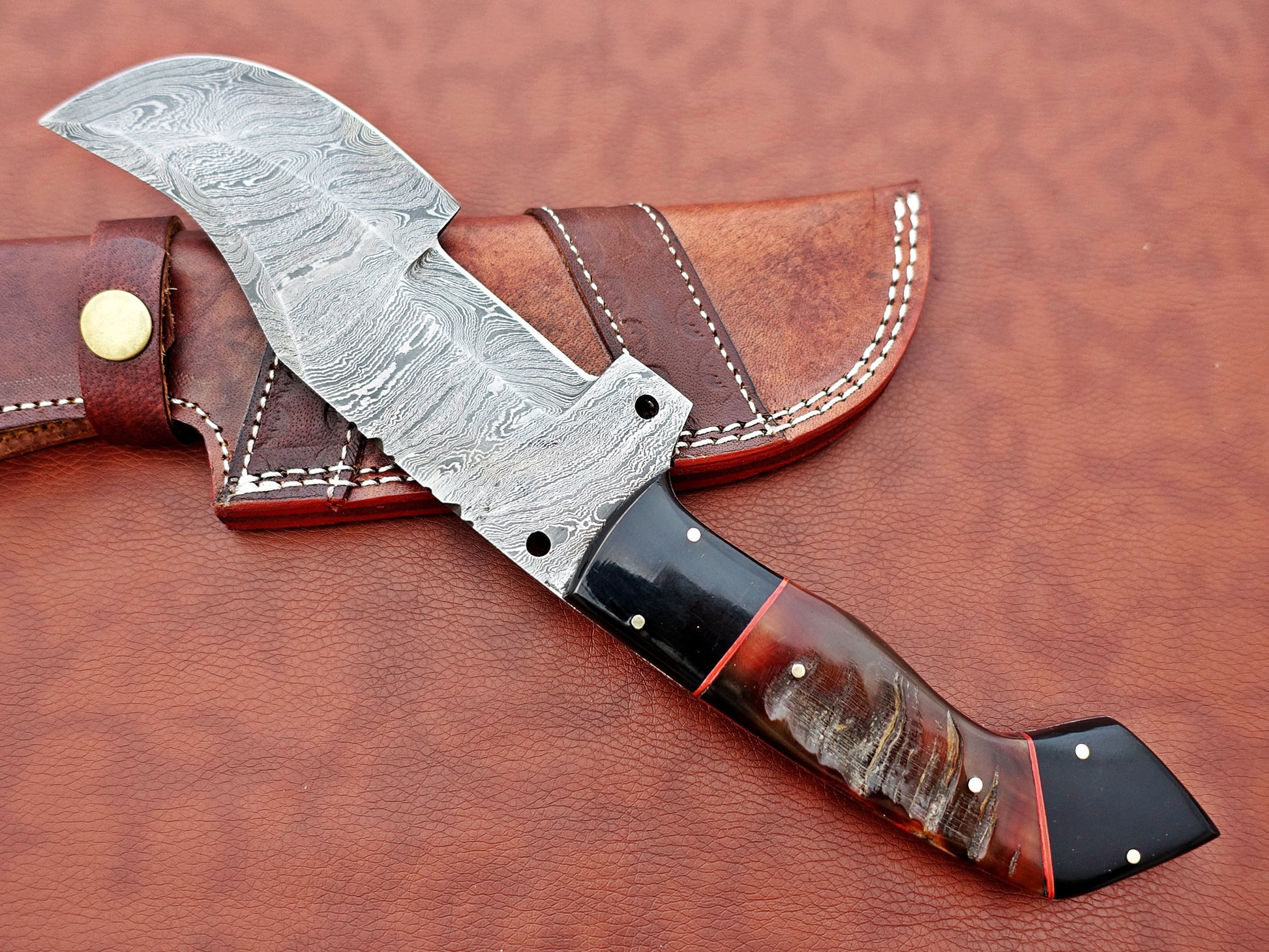 12" Long hand forged twist pattern full tang Damascus steel tracker knife, Ram & Bull horn scale, Cow leather sheath
