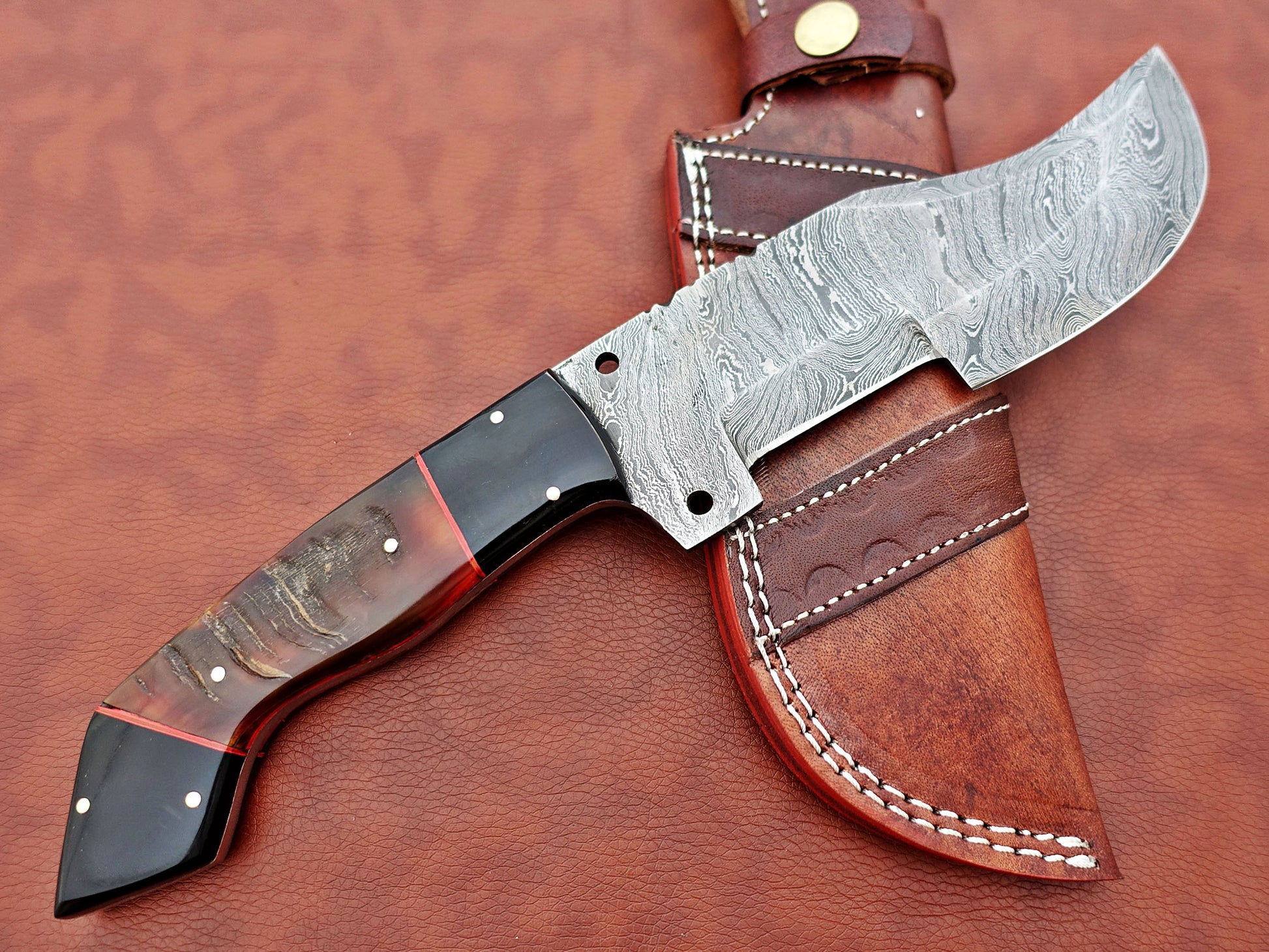 12" Long hand forged twist pattern full tang Damascus steel tracker knife, Ram horn scale with Damascus Bolster & pomel, Cow leather sheath