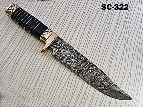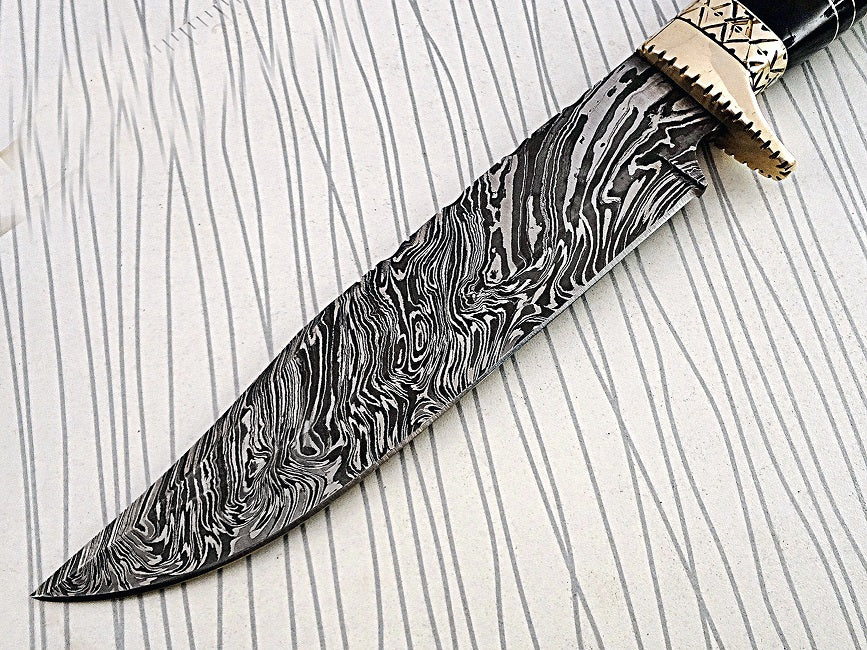 13.5 Inches long Damascus steel custom made bowie Knife bull horn with engraved brass scale Hand Forged 8" blade cow hide leather sheath