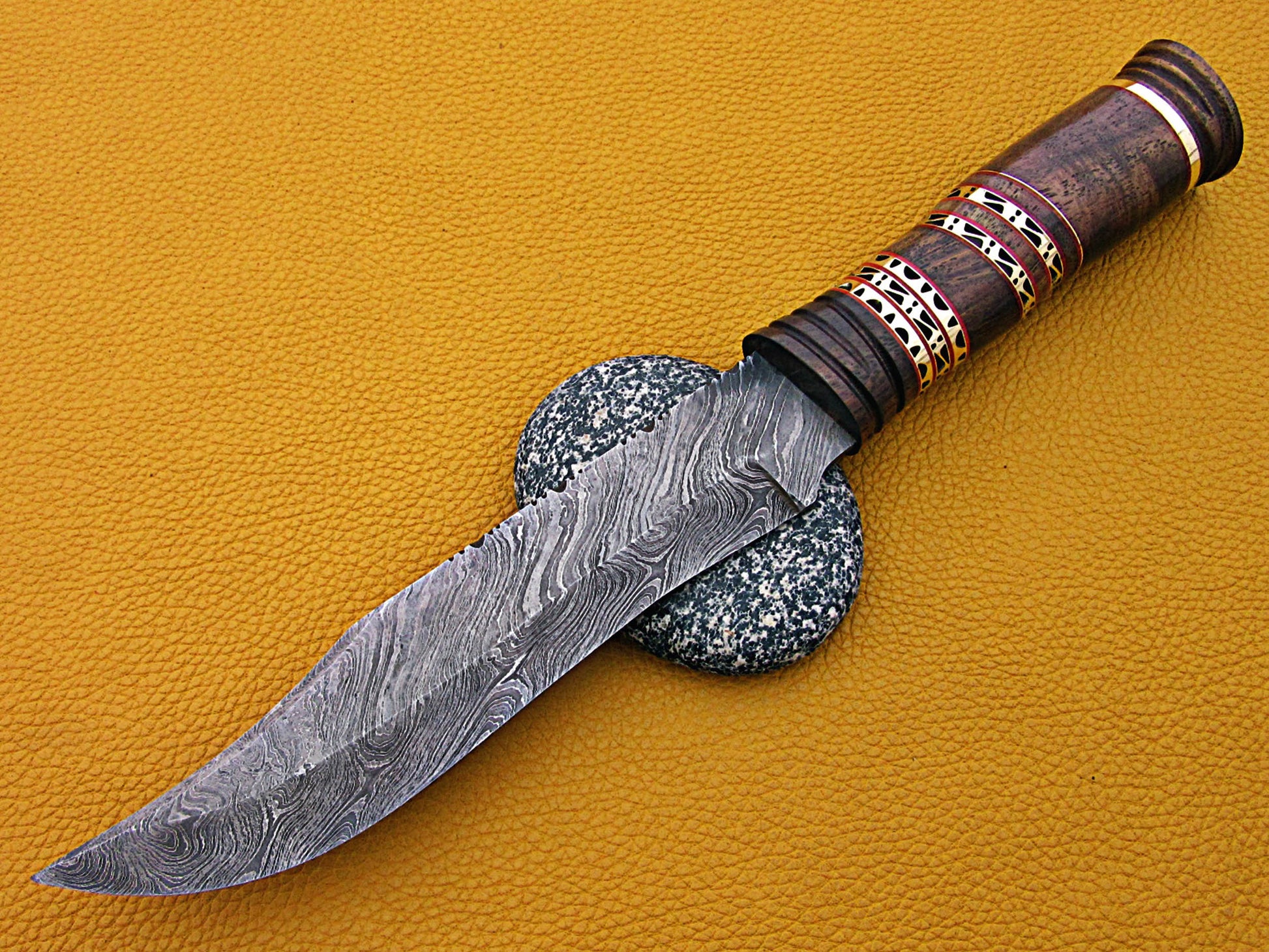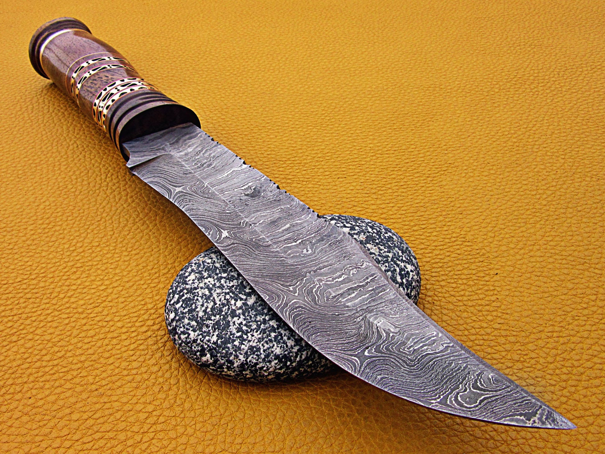 Features: Custom made very exotic Rose wood scale crafted with engraved brass work and fiber spacing. Overall 13.5 Inches Long Damascus steel with 7" Inches cutting edge 5 Inches Rose wood Handle Crafted with engraved Brass Art Work. 5mm thick Twist pattern hand forged Damascus steel. Comes with a fine quality extra thick cow hide leather sheath with belt inserting loop. Blade is made of Damascus steel by forging the 1095 and 15N20 high and low carbon steel with hundreds of layers folded. Blade has been given an excellent heat treatment to get it well hardened Hardness 56 to 58 HRC.