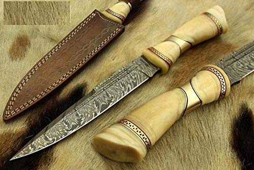 13" Custom Made Hand Forged Damascus Steel Skinning Knife, Round Grip Hand Carved Camel Bone Scale Crafted with Engraved Brass Spacer, Cow Hide Leather Sheath Included with Belt Loop