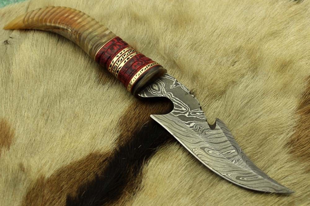 Overall 12.5" Long with 7" long hand forged Damascus steel gut hook blade