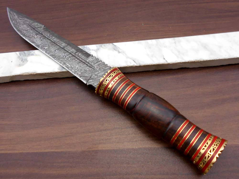 13" hand forged Damascus Hunting Knife, 7" blade, exotic Rose wood scale crafted with engraved brass work and fiber spacing, Leather sheath