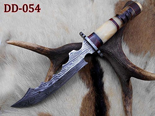 Features: Exotic Ram Horn and Camel Bone scale with red fiber spacing and brass cap Damascus Steel finger guard Overall 13" Long Knife that has 7.5" long Damascus with 6.5 Inches cutting edge Handle Length:4 inches Hand forged Fire pattern Damascus steel blade Comes with a fine quality extra thick cow hide leather sheath Blade is made of Damascus steel by forging the 1095 and 15N20 high and low carbon steel with hundreds of layers folded Blade has been given an excellent heat treatment to get it well hardened Hardness 56 to 58 HRC. If you want more information, OR have queries, please contact us without any hesitation. Note: You will receive the same knife as shown in the pictures. Custom Made Only One Piece. Tips to Care Damascus knife: Damascus steel as well as 1095 high carbon steel knives are different than some other common steel knives,because of its high carbon content they can be rusted if not care properly. If you have seen rust accidently then use WD40 to remove it Never store your knife for long time in leather sheath. Leather can absorb water which will rust the knife. Always clean the blade after using and apply oil or wax (please use cooking oil on Chef Knife) before you store it, for its longer life and durability. CAUTION: Before bidding or buying items please make sure that the state, local and federal laws of your area allow the item to reach you? If your purchase is held by custom authorities in your country or state then I will not be responsible for that and no refund will be given. We will not be responsible for any loss because of wrong or deliverable shipping address. DISCLAIMER: Our knives are very sharp so open and use them very carefully. We are not responsible for any injuries associated with the use of our knives. Our products are intended for legal use only by responsible buyers. We will not sell our products to anyone under the age of 18