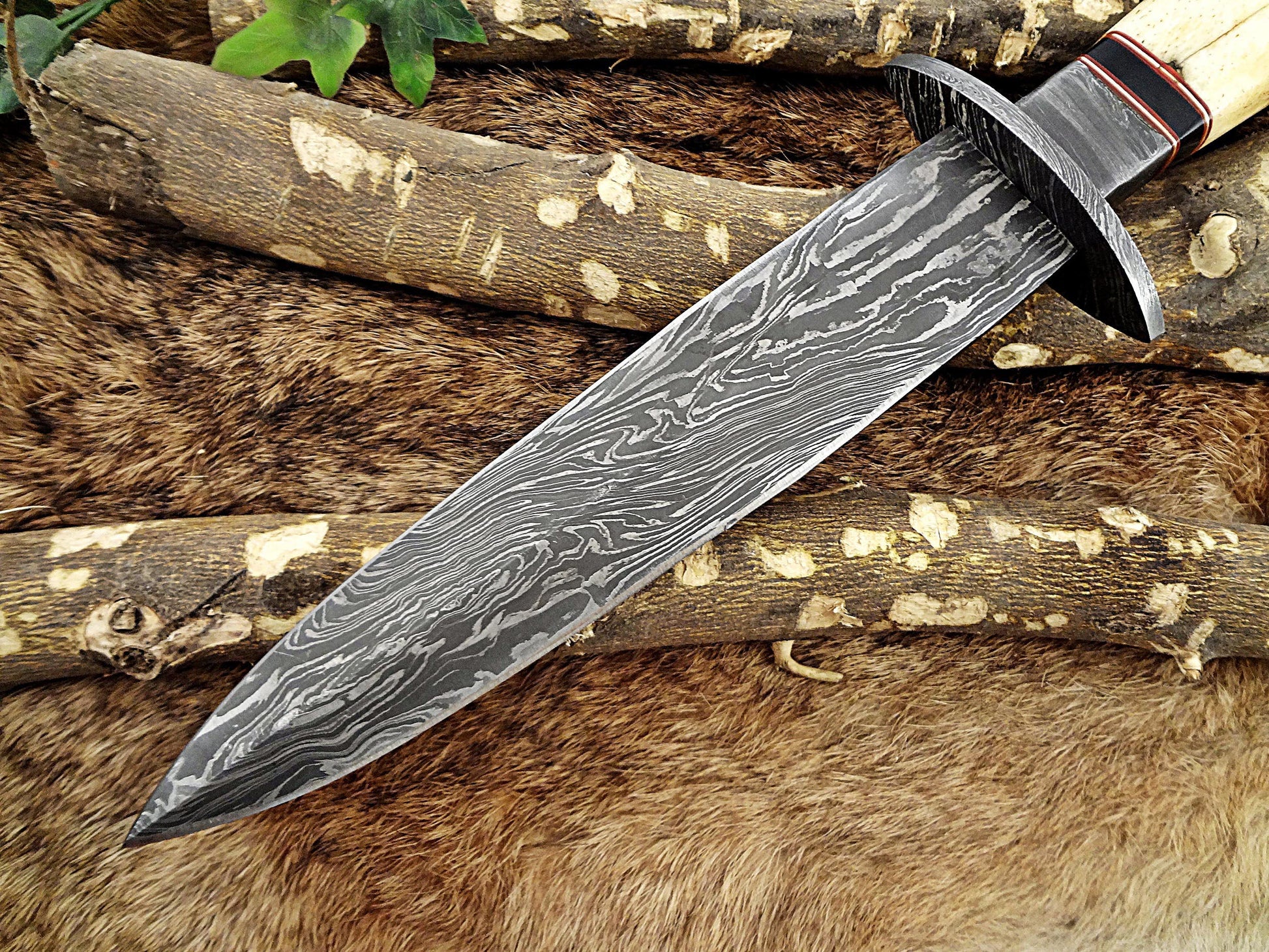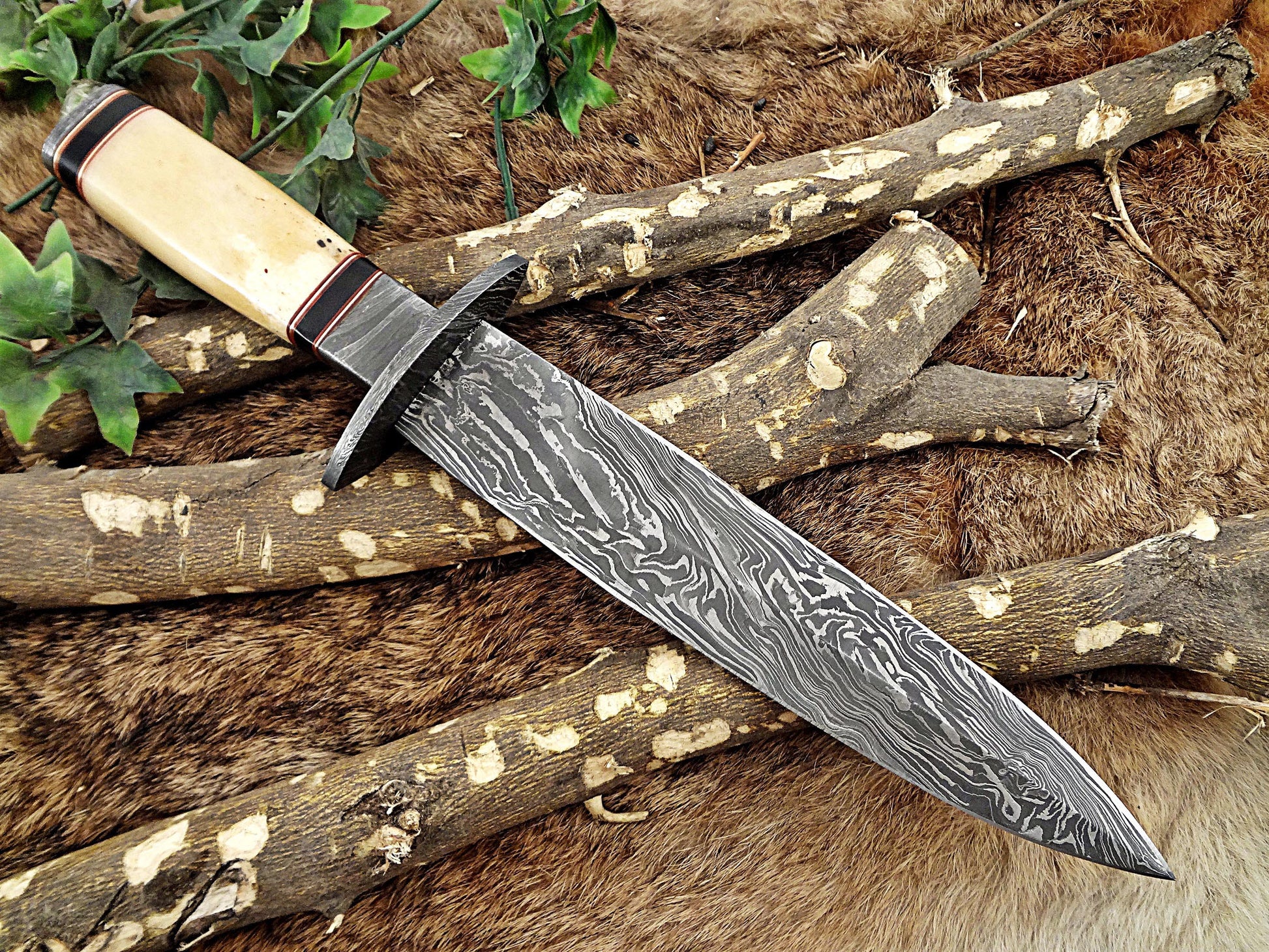Camel bone with bull horn. Damascus bolster and finger guard scale nOverall 13″ Long with 7.5″ long double edge blade