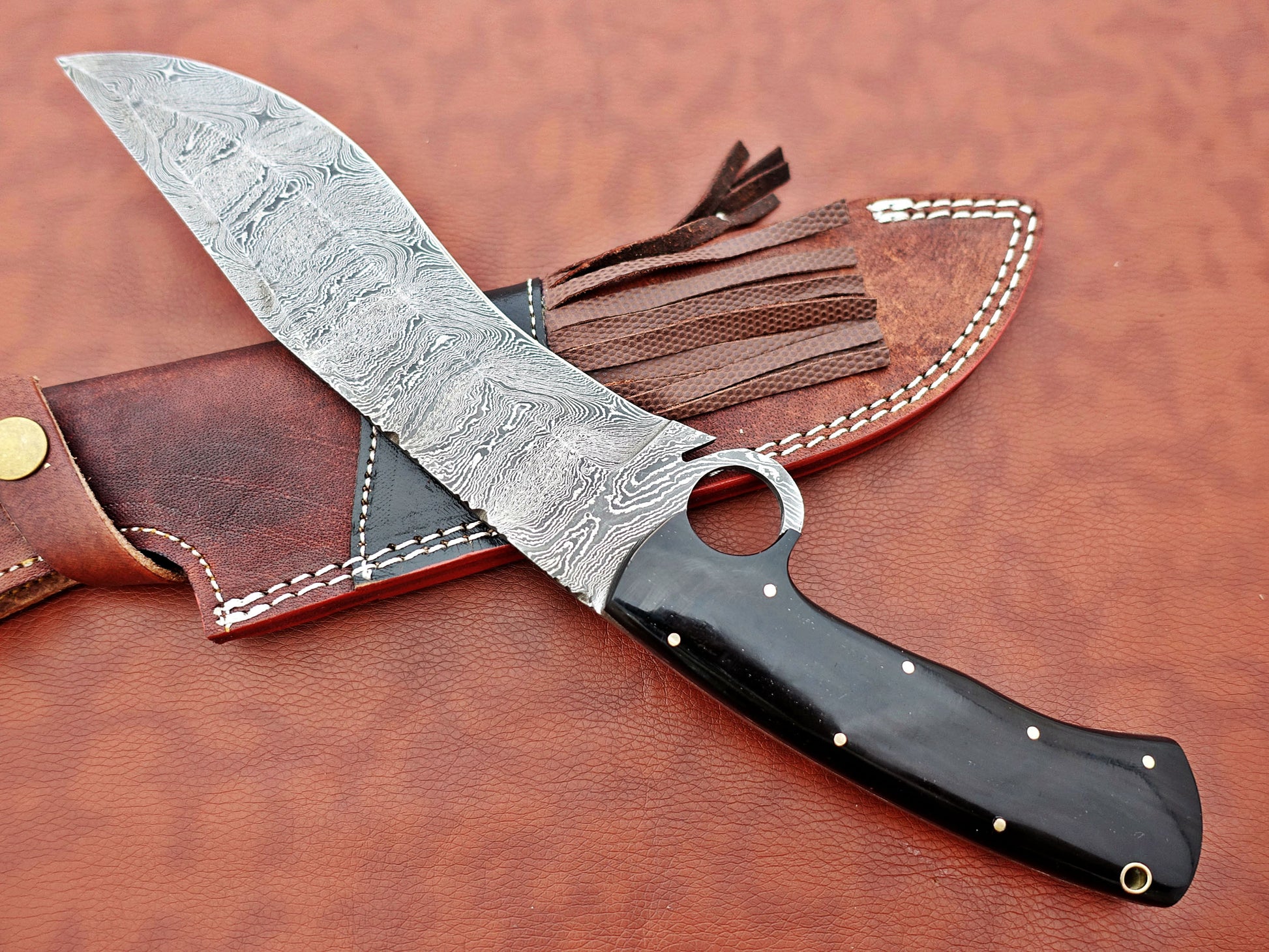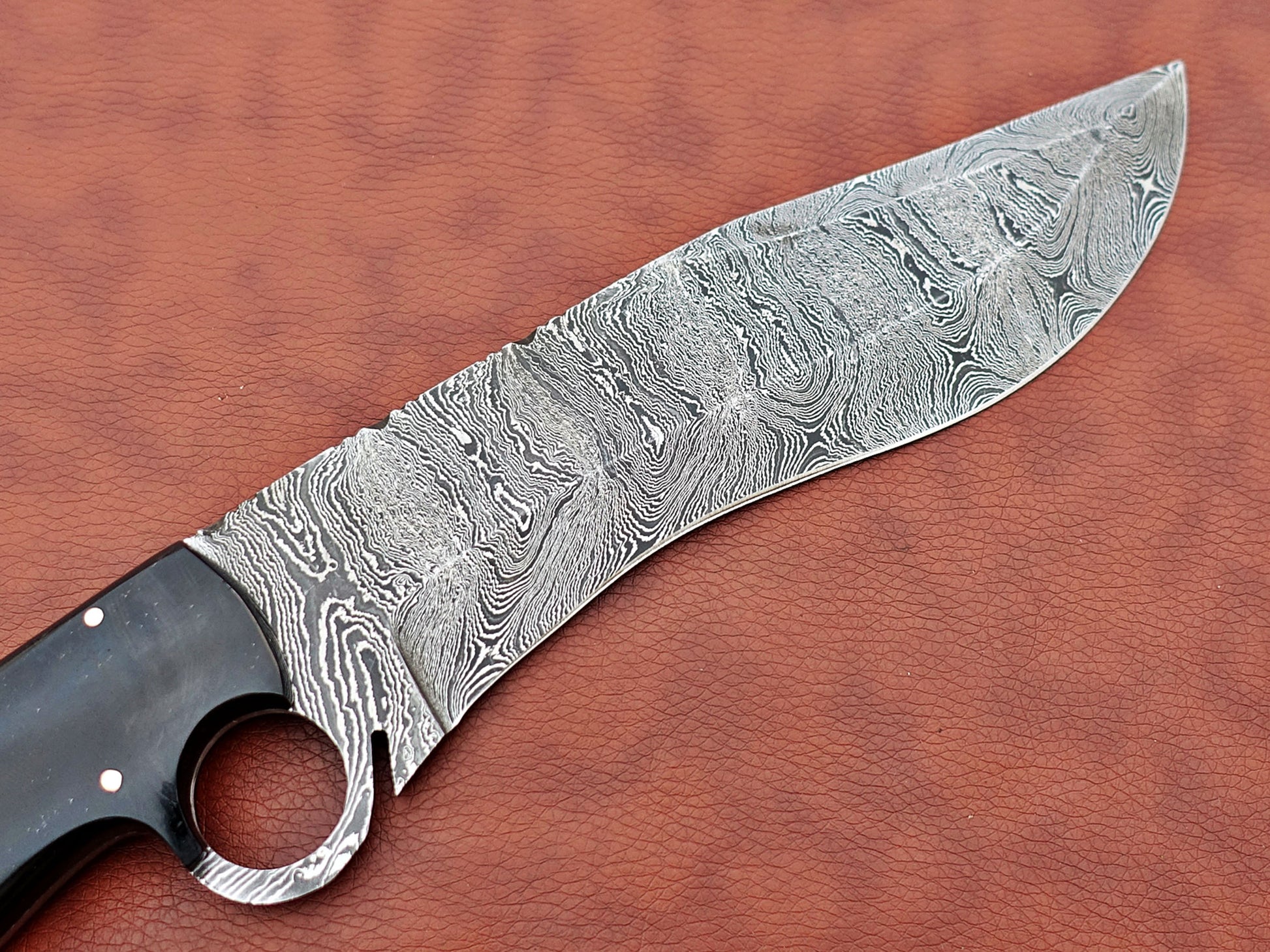 13" Long hand forged Damascus steel Nessmuk machete with finger hole, Black bull horn scale with inserting hole, Cow Leather sheath
