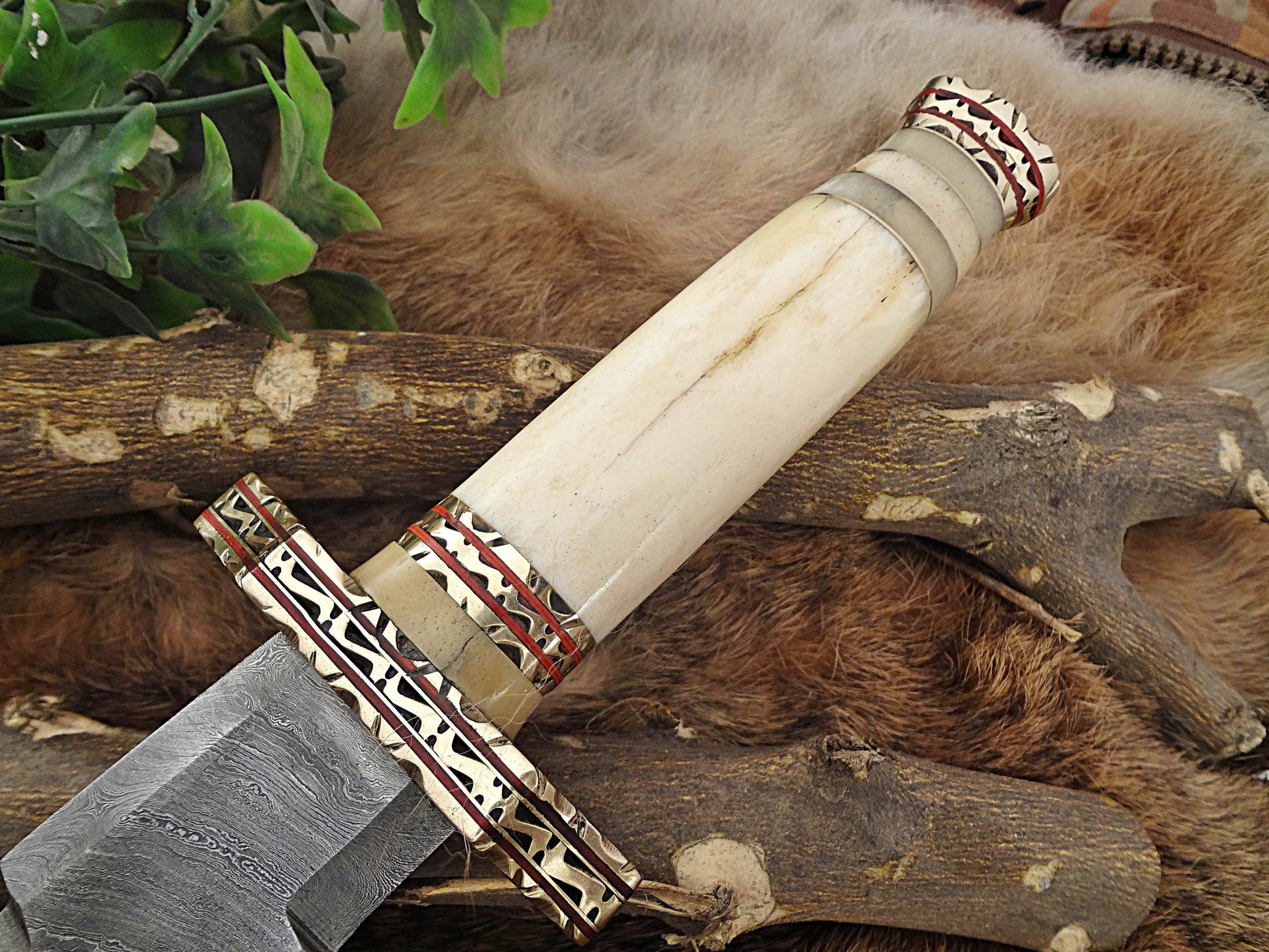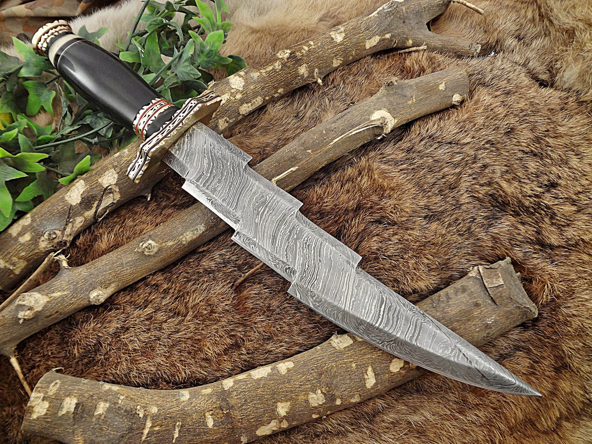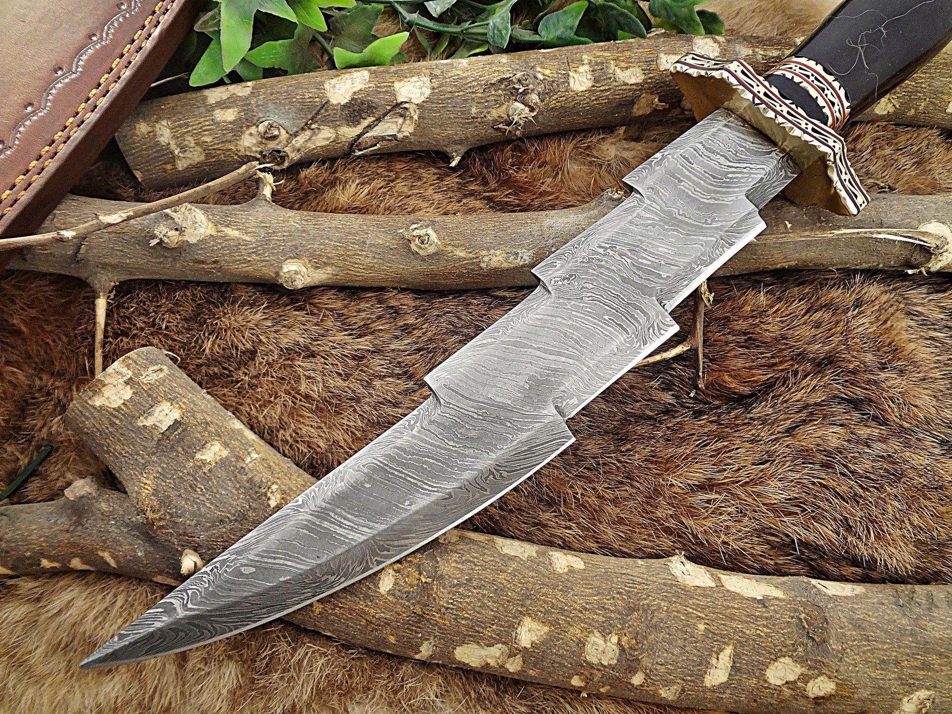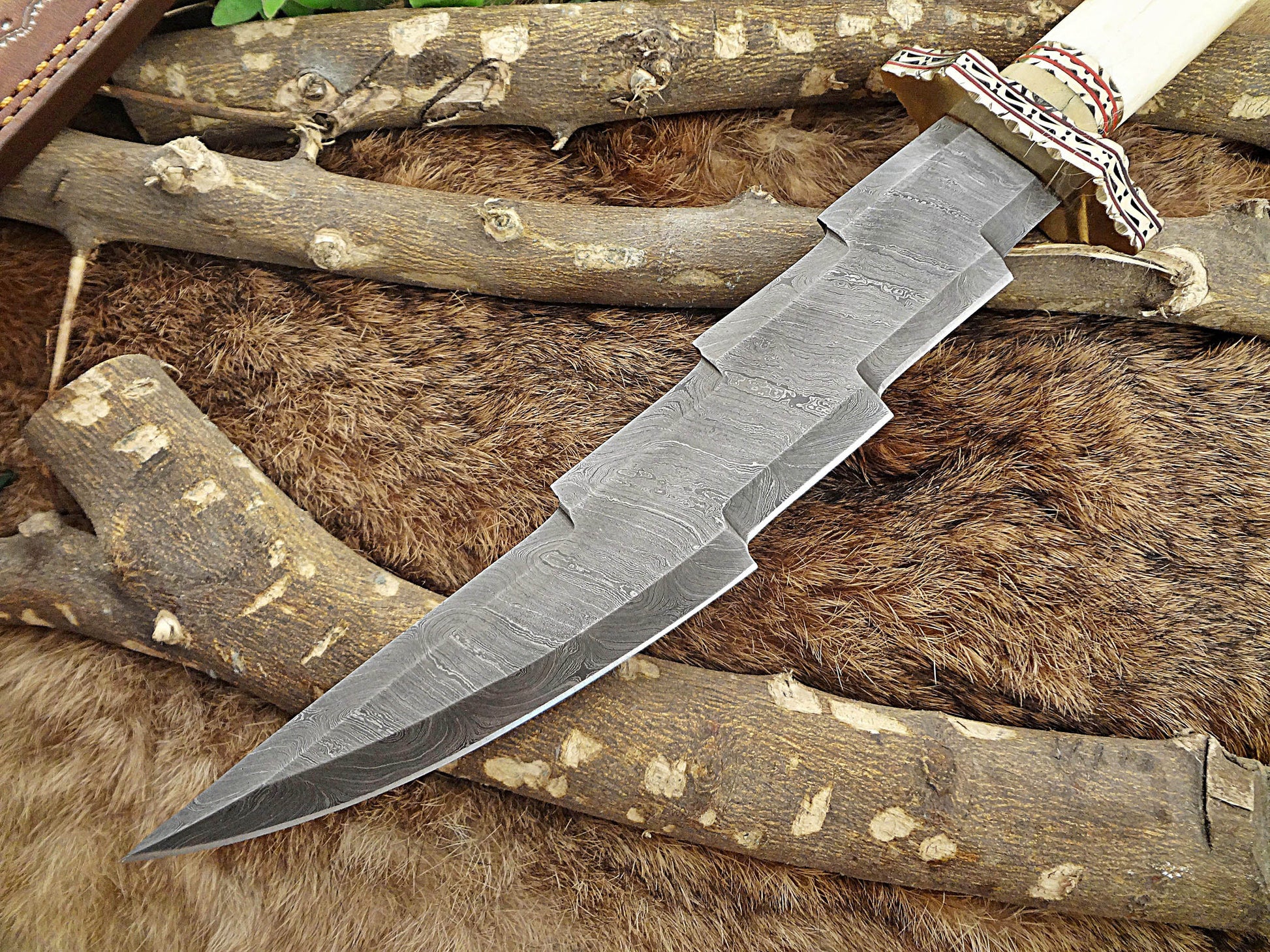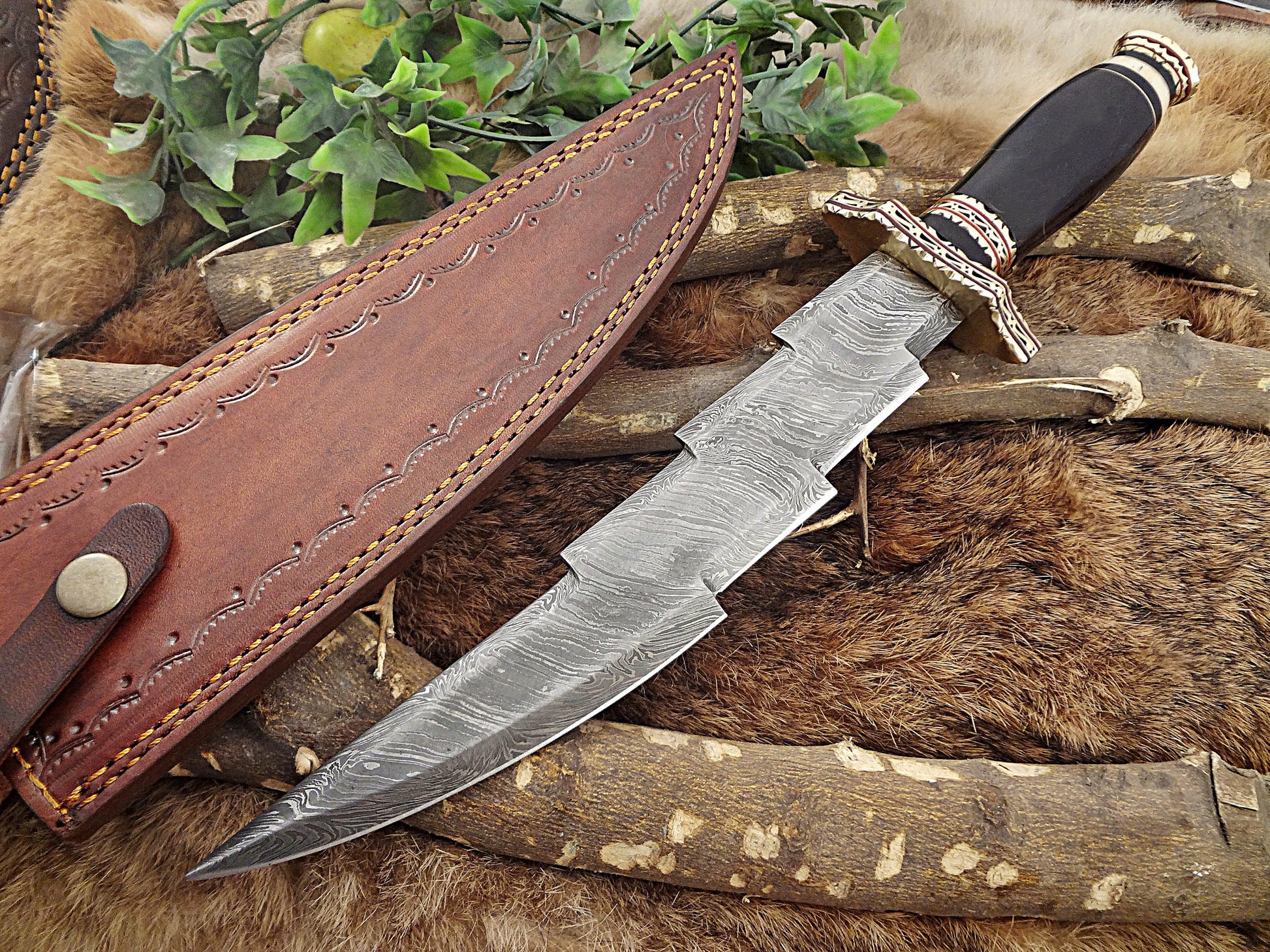 14.5" long custom made Hand Forged Damascus Steel zig zag blade Knife With 9" blade, camel bone with engraved brass scale Leather sheath