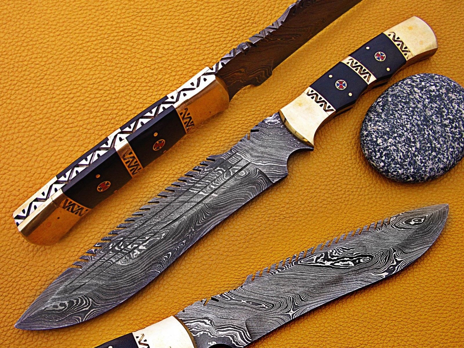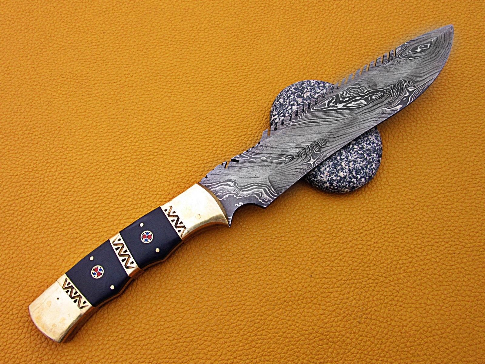 14″ long Damascus steel full tang blade hunting knife, Bull horn scale with engraved Brass spacer & bolster, Co hide Leather sheath