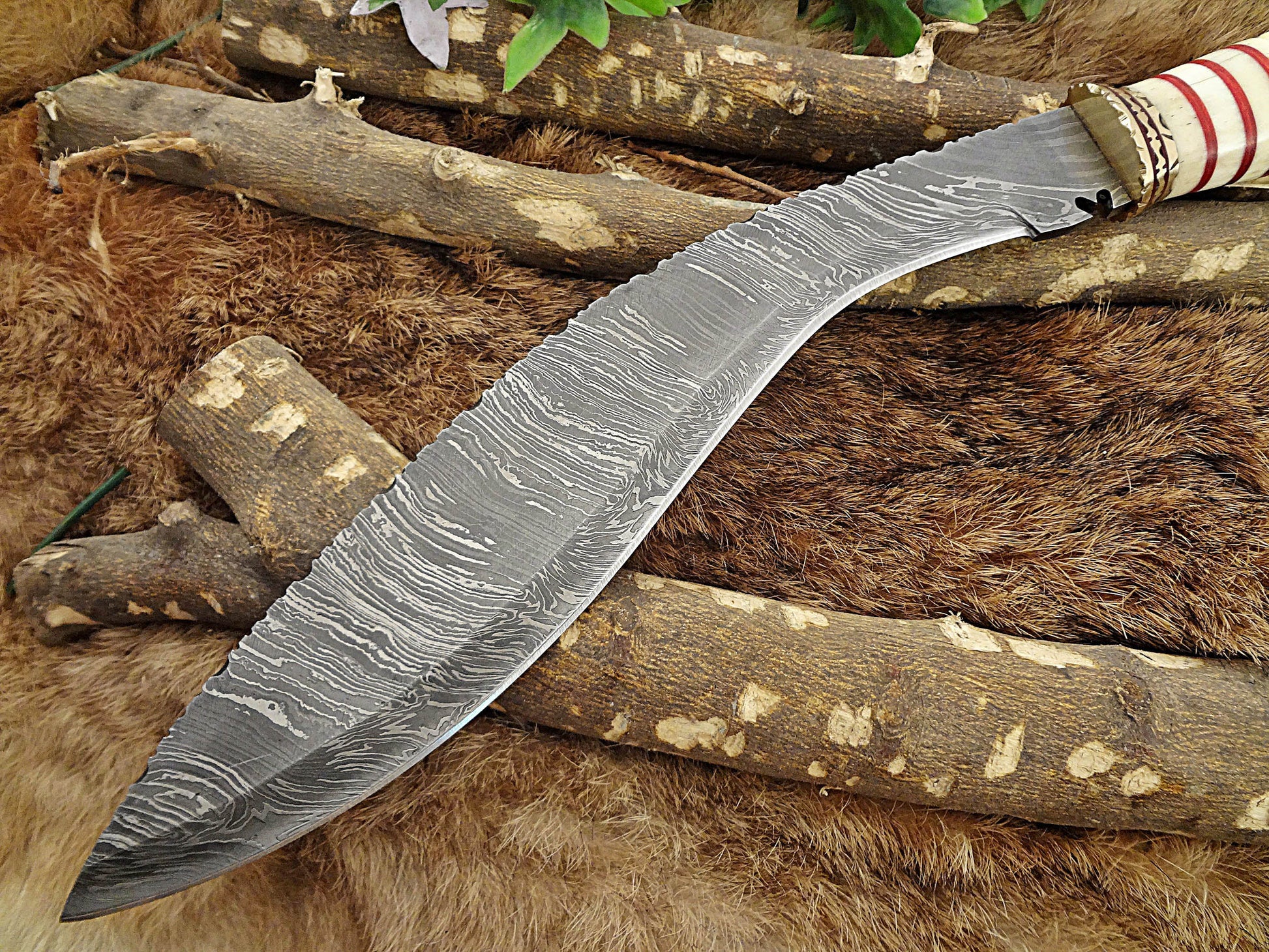 15" custom made Hand Forged Damascus Steel Kukri Knife With 10" blade, camel bone with engraved brass finger guard scale, Leather Sheath